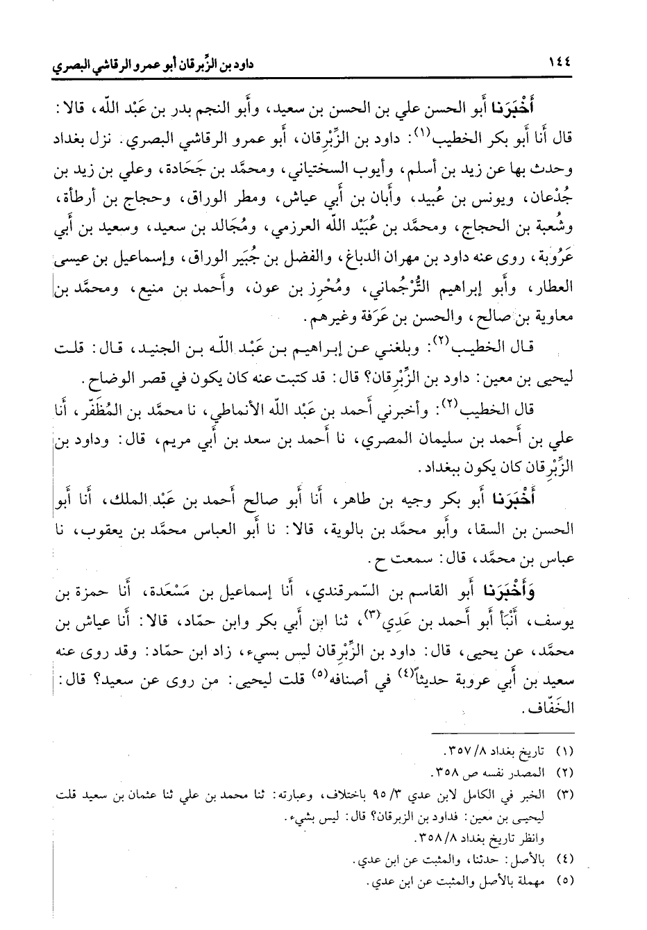 أخبرنا أبو الحسن علي بن الحسن بن سعيد وأبو النجم بدر بن عبد الله قالا قال أنا أبو بكر الخطيب (1) داود بن الزبرقان أبو عمرو الرقاشي البصري نزل بغداد وحدث بها عن زيد بن أسلم وأيوب السختياني ومحمد بن جحادة وعلي بن زيد بن جدعان ويونس بن عبيد وأبان بن أبي عياش ومطر الوراق وحجاج بن أرطأة وشعبة بن الحجاج ومحمد بن عبيد الله العرزمي ومجالد بن سعيد وسعيد بن أبي عروبة روى عنه داود بن مهران الدباغ والفضل بن جبير الوراق وإسماعيل بن عيسى العطار وأبو إبراهيم الترجماني ومحرز بن عون وأحمد بن منيع ومحمد بن معاوية بن صالح والحسن بن عرفة وغيرهم قال الخطيب (2) وبلغني عن إبراهيم بن عبد الله بن الجنيد قال قلت ليحيى بن معين داود بن الزبرقان قال قد كتبت عنه كان يكون في قصر الوضاح قال الخطيب (2) وأخبرني أحمد بن عبد الله الأنماطي نا محمد بن المظفر أنا علي بن أحمد بن سليمان المصري نا أحمد بن سعد بن أبي مريم قال وداود بن الزبرقان كان يكون ببغداد أخبرنا أبو بكر وجيه بن طاهر أنا أبو صالح أحمد بن عبد الملك أنا أبو الحسن بن السقا وأبو محمد بن بالوية قالا نا أبو العباس محمد بن يعقوب نا عباس بن محمد قال سمعت وأخبرنا أبو القاسم بن السمرقندي أنا إسماعيل بن مسعدة أنا حمزة بن يوسف أنبأ أبو أحمد بن عدي (3) ثنا ابن أبي بكر وابن حماد قالا أنا عياش بن محمد عن يحيى قال داود بن الزبرقان ليس بسئ زاد ابن حماد وقد روى عنه سعيد بن أبي عروبة حديثا (4) في أصنافه (5) قلت ليحيى من روى عن سعيد قال الخفاف