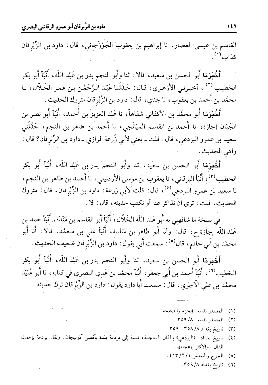 القاسم بن عيسى العصار نا إبراهيم بن يعقوب الجوزجاني قال داود بن الزبرقان كذاب (1) أخبرنا أبو الحسن بن سعيد قالا ثنا وأبو النجم بدر بن عبد الله أنبأ أبو بكر الخطيب (2) أخبرني الأزهري قال حدثنا عبد الرحمن بن عمر الخلال نا محمد بن أحمد بن يعقوب نا جدي قال داود بن الزبرقان متروك الحديث أخبرنا أبو محمد بن الأكفاني شفاها نا عبد العزيز بن أحمد أنبأ أبو نصر بن الجبان إجازة نا أحمد بن القاسم الميانجي نا أحمد بن طاهر بن النجم حدثني سعيد بن عمرو البردعي قال قلت يعني لأبي زرعة الرازي داود بن الزبرقان قال واهي الحديث أخبرنا أبو الحسن بن سعيد ثنا وأبو النجم بدر بن عبد الله أنبأ أبو بكر الخطيب (3) أنبأ البرقاني نا يعقوب بن موسى الأردبيلي نا أحمد بن طاهر بن النجم نا سعيد بن عمرو البردعي (4) قال قلت لأبي زرعة داود بن الزبرقان قال متروك الحديث قلت ترى أن نذاكر عنه أو نكتب حديثه قال لا في نسخة ما شافهني به أبو عبد الله الخلال أنبأ أبو القاسم بن مندة أنبأ حمد بن عبد الله إجازة قال وأنا أبو طاهر بن سلمة أنبأ علي بن محمد قالا أنا أبو محمد بن أبي حاتم قال (5) سمعت أبي يقول داود بن الزبرقان ضعيف الحديث أخبرنا أبو الحسن بن سعيد ثنا وأبو النجم بدر بن عبد الله أنبأ أبو بكر الخطيب (6) أنبأ أحمد بن أبي جعفر أنبأ محمد بن عدي البصري في كتابه نا أبو عبيد محمد بن علي الآجري قال سمعت أبا داود يقول داود بن الزبرقان ترك حديثه
