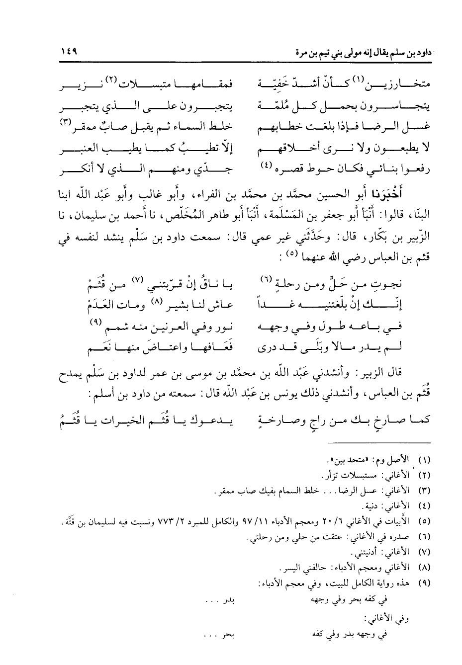 رفعوا بنائي فكان حوط قصره (4) * جدي ومنهم الذي لا أنكر * أخبرنا أبو الحسين محمد بن محمد بن الفراء وأبو غالب وأبو عبد الله ابنا البنا قالوا أنبأ أبو جعفر بن المسلمة أنبأ أبو طاهر المخلص نا أحمد بن سليمان نا الزبير بن بكار قال وحدثني غير عمي قال سمعت داود بن سلم ينشد لنفسه في قثم بن العباس Bهما (5) * نجوة من حل ومن رحلة (6) * يا ناق إن قربتني (7) من قثم إنك إن بلغتنيه غدا * عاش لنا بشير (8) ومات العدم في باعه طول وفي وجهه * نور وفي العرنين منه شمم (9) لم يدر مالا وبلى قد درى * فعافها واعتاض منها نعم * قال الزبير وأنشدني عبد الله بن محمد بن موسى بن عمر لداود بن سلم يمدح قثم بن العباس وأنشدني ذلك يونس بن عبد الله قال سمعته من داود بن أسلم كما صارخ بك من راج وصارخة * يدعوك يا قثم الخيرات يا قثم