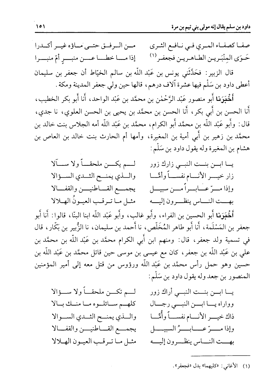 صفا كصفاء المري في نافع الثرى * من الرفق حتى ماؤه غير أكدرا حوى المنبرين الطاهرين فجعفر (1) إذا ما خطا عن منبر أم منبرا * قال الزبير فحدثني يونس بن عبد الله بن سالم الخياط أن جعفر بن سليمان أعطى داود بن سلم فيها عشرة آلاف درهم قالها حين ولي جعفر المدينة ومكة أخبرنا أبو منصور عبد الرحمن بن محمد بن عبد الواحد أنا أبو بكر الخطيب أنا الحسن بن أبي بكر أنا الحسن بن محمد بن يحيى بن الحسن العلوي نا جدي قال وأبو عبد الله بن محمد أبو الكرام محمد بن عبد الله أمه الجلاس بنت خالد بن محمد بن زهير بن أبي أمية بن المغيرة وأمها أم الحارث بنت خالد بن العاص بن هشام بن المغيرة وله يقول داود بن سلم * يا ابن بنت النبي زارك زور * لم يكن ملحقا ولا سآلا زار خير الأنام نفسا وأما * والذي يمنح الثدي السؤالا وإذا مر عابرا من سبيل * يجمع القاطنين والقفالا بهت الناس ينظرون إليه * مثل ما ترقب العيون الهلالا * أخبرنا أبو الحسين بن الفراء وأبو غالب وأبو عبد الله ابنا البنا قالوا أنا أبو جعفر بن المسلمة أنا أبو طاهر المخلص نا أحمد بن سليمان نا الزبير بن بكار قال في تسمية ولد جعفر قال ومنهم ابن أبي الكرام محمد بن عبد الله بن محمد بن علي بن عبد الله بن جعفر كان مع عيسى بن موسى حين قاتل محمد بن عبد الله بن حسين وهو حمل رأس محمد بن عبد الله ورؤوس من قتل معه إلى أمير المؤمنين المنصور بن جعد وله يقول داود بن سلم يا ابن بنت النبي أراك زور * لم تكن ملحقا ولا سؤالا وواراه يا ابن النبي رجال * كلهم سائلوه ما منك بالا ذاك خير الأنام نفسا وأما * والذي يمنح الثدي السوالا وإذا مر عابر السبيل * يجمع القاطنين والقفالا بهت الناس ينظرون إليه * مثل ما ترقب العيون الهلالا *