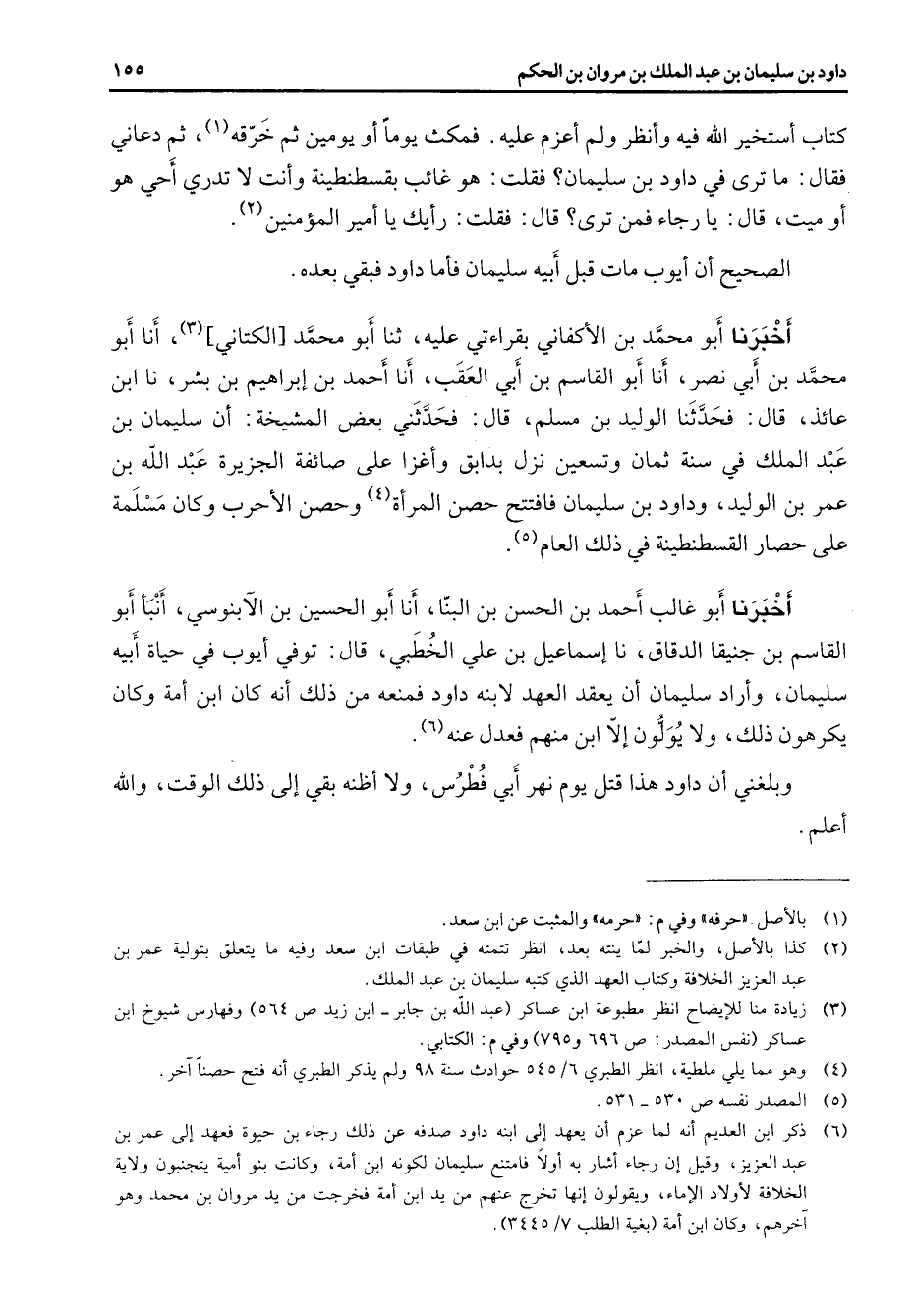 كتاب أستخير الله فيه وأنظر ولم أعزم عليه فمكث يوما أو يومين ثم خرقه (1) ثم دعاني فقال ما ترى في داود بن سليمان فقلت هو غائب بقسطنطينة وأنت لا تدري أحي هو أو ميت قال يا رجاء فمن ترى قال فقلت رأيك يا أمير المؤمنين (2) الصحيح أن أيوب مات قبل أبيه سليمان فأما داود فبقي بعده أخبرنا أبو محمد بن الأكفاني بقراءتي عليه ثنا أبو محمد الكتاني أنا أبو (3) محمد بن أبي نصر أنا أبو القاسم بن أبي العقب أنا أحمد بن إبراهيم بن بشر نا ابن عائذ قال فحدثنا الوليد بن مسلم قال فحدثني بعض المشيخة أن سليمان بن عبد الملك في سنة ثمان وتسعين نزل بدابق وأغزا على صائفة الجزيرة عبد الله بن عمر بن الوليد وداود بن سليمان فافتتح حصن المرأة (4) وحصن الأحرب وكان مسلمة على حصار القسطنطينة في ذلك العام (5) أخبرنا أبو غالب أحمد بن الحسن بن البنا أنا أبو الحسين بن الآبنوسي أنبأ أبو القاسم بن جنيقا الدقاق نا إسماعيل بن علي الخطبي قال توفي أيوب في حياة أبيه سليمان وأراد سليمان أن يعقد العهد لابنه داود فمنعه من ذلك أنه كان ابن أمة وكان يكرهون ذلك ولا يولون إلا ابن منهم فعدل عنه (6) وبلغني أن داود هذا قتل يوم نهر أبي فطرس ولا أظنه بقي إلى ذلك الوقت والله أعلم