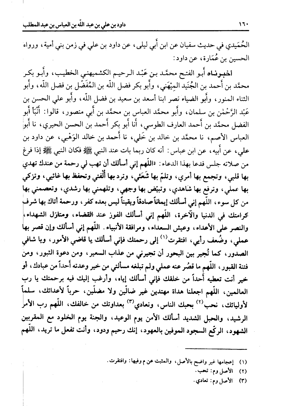 الحميدي في حديث سفيان عن ابن أبي ليلى عن داود بن علي في زمن بني أمية ورواه الحسين بن عمارة عن داود أخبرناه أبو الفتح محمد بن عبد الرحيم الكشميهني الخطيب وأبو بكر محمد بن أحمد بن الجنيد الميهني وأبو بكر فضل الله بن المفضل بن فضل الله وأبو الثناء المنور وأبو الضياء نصر ابنا أسعد بن سعيد بن فضل الله وأبو علي الحسن بن عبد الرحمن بن سلمان وأبو محمد العباس بن محمد بن أبي منصور قالوا أنبأ أبو الفضل محمد بن أحمد العارف الطوسي أنا أبو بكر أحمد بن الحسن الحيري نا أبو العباس الأصم نا محمد بن خالد بن خلي نا أحمد بن خالد الوهبي عن داود بن علي عن أبيه عن ابن عباس أنه كان ربما بات عند النبي (صلى الله عليه وسلم) فكان النبي (صلى الله عليه وسلم) إذا فرغ من صلاته جلس فدعا بهذا الدعاء اللهم إني أسألك أن تهب لي رحمة من عندك تهدي بها قلبي وتجمع بها أمري وتلم بها شعثي وترد بها ألفتي وتحفظ بها غائبي وتزكي بها عملي وترفع بها شاهدي وتبيض بها وجهي وتلهمني بها رشدي وتعصمني بها من كل سوء اللهم إني أسألك إيمانا صادقا ويقينا ليس بعده كفر ورحمة أتاك بها شرف كرامتك في الدنيا والآخرة اللهم إني أسألك الفوز عند القضاء ومنازل الشهداء والنصر على الأعداء وعيش السعداء ومرافقة الأنبياء اللهم إني أسألك وإن قصر بها عملي وضعف رأيي افتقرت (1) إلى رحمتك فإني أسألك يا قاضي الأمور ويا شافي الصدور كما تجير بين البحور أن تجيرني من عذاب السعير ومن دعوة الثبور ومن فتنة القبور اللهم ما قصر عنه عملي ولم تبلغه مسألتي من خير وعدته أحدا من عبادك أو خير أنت تعطيه أحدا من خلقك فإني أسألك إياه وأرغب إليك فيه برحمتك يا رب العالمين اللهم اجعلنا هداة مهتدين غير ضالين ولا مضلين حربا لأعدائك سلما لأوليائك نحب (2) بحبك الناس ونعادي (3) بعداوتك من خالفك اللهم رب الأمر الرشيد والحبل الشديد أسألك الأمن يوم الوعيد والجنة يوم الخلود مع المقربين الشهود الركع السجود الموفين بالعهود إنك رحيم ودود وأنت تفعل ما تريد اللهم