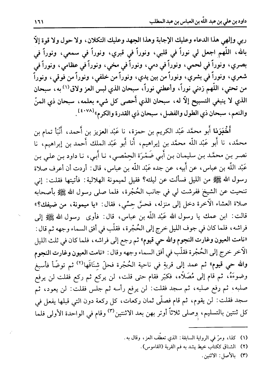 ربي وإلهي هذا الدعاء وعليك الإجابة وهذا الجهد وعليك التكلان ولا حول ولا قوة إلا بالله اللهم اجعل لي نورا في قلبي ونورا في قبري ونورا في سمعي ونورا في بصري ونورا في لحمي ونورا في دمي ونورا في مخي ونورا في عظامي ونورا في شعري ونورا في بشري ونورا من بين يدي ونورا من خلفي ونورا من فوقي ونورا من تحتي اللهم زدني نورا واعطني نورا سبحان الذي لبس العز ولاق (1) به سبحان الذي لا ينبغي التسبيح إلا له سبحان الذي أحصى كل شئ بعلمه سبحان ذي المن والنعم سبحان ذي الطول والفضل سبحان ذي القدرة والكرم أخبرنا أبو محمد عبد الكريم بن حمزة نا عبد العزيز بن أحمد أنبأ تمام بن محمد نا أبو عبد الله محمد بن إبراهيم أنا أبو عبد الملك أحمد بن إبراهيم نا نصر بن محمد بن سليمان بن أبي ضمرة الحمصي نا أبي نا داود بن علي بن عبد الله بن عباس عن أبيه عن جده عبد الله بن عباس قال أردت أن أعرف صلاة رسول الله (صلى الله عليه وسلم) من الليل فسألت عن ليلته فقيل لميمونة الهلالية فأتيتها فقلت إني تنحيت عن الشيخ ففرشت لي في جانب الحجرة فلما صلى رسول الله (صلى الله عليه وسلم) بأصحابه صلاة العشاء الآخرة دخل إلى منزله فحس حسي فقال يا ميمونة من ضيفك قالت ابن عمك يا رسول الله عبد الله بن عباس قال فأوى رسول الله (صلى الله عليه وسلم) إلى فراشه فلما كان في جوف الليل خرج إلى الحجرة فقلب في أفق السماء وجهه ثم قال نامت العيون وغارت النجوم والله حي قيوم ثم رجع إلى فراشه فلما كان في ثلث الليل الآخر خرج إلى الحجرة فقلب في أفق السماء وجهه وقال نامت العيون وغارت النجوم والله حي قيوم ثم عمد إلى قربة في ناحية الحجرة فحل شناقها (2) ثم توضأ فأسبغ وضوءه ثم قام إلى مصلاه فكبر فقام حتى قلت لن يركع ثم ركع فقلت لن يرفع صلبه ثم رفع صلبه ثم سجد فقلت لن يرفع رأسه ثم جلس فقلت لن يعود ثم سجد فقلت لن يقوم ثم قام فصلى ثمان ركعات كل ركعة دون التي قبلها يفعل في كل ثنتين بالتسليم وصلى ثلاثا أوتر بهن بعد الاثنتين (3) وقام في الواحدة الأولى فلما