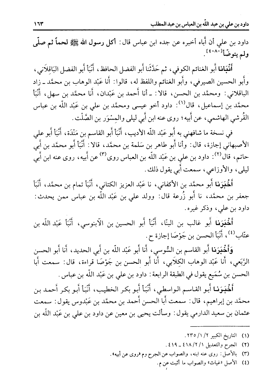 داود بن علي أن أباه أخبره عن جده ابن عباس قال أكل رسول الله (صلى الله عليه وسلم) لحما ثم صلى ولم يتوضأ أنبأنا أبو الغنائم الكوفي ثم حدثنا أبو الفضل الحافظ أنبأ أبو الفضل الباقلاني وأبو الحسين الصيرفي وأبو الغنائم واللفظ له قالوا أنا عبد الوهاب بن محمد زاد الباقلاني ومحمد بن الحسن قالا أنا أحمد بن عبدان أنا محمد بن سهل أنبأ محمد بن إسماعيل قال (1) داود أخو عيسى ومحمد بن علي بن عبد الله بن عباس القرشي الهاشمي عن أبيه روى عنه ابن أبي ليلى والمسور بن الصلت في نسخة ما شافهني به أبو عبد الله الأديب أنبأ أبو القاسم بن مندة أنبأ أبو علي الأصبهاني إجازة قال وأنا أبو طاهر بن سلمة بن محمد قالا أنبأ أبو محمد بن أبي حاتم قال داود بن علي بن عبد الله بن العباس روى عن أبيه روى (3) عنه ابن أبي ليلى والأوزاعي سمعت أبي يقول ذلك أخبرنا أبو محمد بن الأكفاني نا عبد العزيز الكتاني أنبأ تمام بن محمد أنبأ جعفر بن محمد نا أبو زرعة قال وولد علي بن عبد الله بن عباس ممن يحدث داود بن علي وذكر غيره أخبرنا أبو غالب بن البنا أنبأ أبو الحسين بن الآبنوسي أنبأ عبد الله بن عتاب (4) أنبأ الحسن بن جوصا إجازة وأخبرنا أبو القاسم بن السوسي أنا أبو عبد الله بن أبي الحديد أنا أبو الحسن الربعي أنا عبد الوهاب الكلابي أنا أبو الحسن بن جوصا قراءة قال سمعت أبا الحسن بن سميع يقول في الطبقة الرابعة داود بن علي بن عبد الله بن عباس أخبرنا أبو القاسم الواسطي أنبأ أبو بكر الخطيب أنبأ أبو بكر أحمد بن محمد بن إبراهيم قال سمعت أبا الحسن أحمد بن محمد بن عبدوس يقول سمعت عثمان بن سعيد الدارمي يقول وسألت يحيى بن معين عن داود بن علي بن عبد الله بن