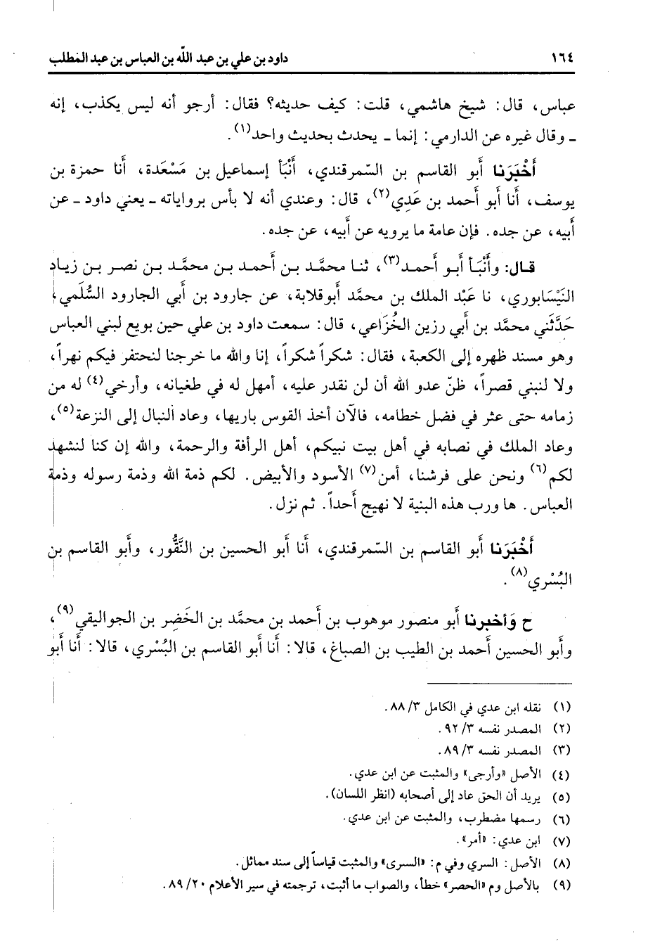عباس قال شيخ هاشمي قلت كيف حديثه فقال أرجو أنه ليس يكذب إنه وقال غيره عن الدارمي إنما يحدث بحديث واحد (1) أخبرنا أبو القاسم بن السمرقندي أنبأ إسماعيل بن مسعدة أنا حمزة بن يوسف أنا أبو أحمد بن عدي (2) قال وعندي أنه لا بأس برواياته يعني داود عن أبيه عن جده فإن عامة ما يرويه عن أبيه عن جده قال وأنبأ أبو أحمد (3) ثنا محمد بن أحمد بن محمد بن نصر بن زياد النيسابوري نا عبد الملك بن محمد أبو قلابة عن جارود بن أبي الجارود السلمي حدثني محمد بن أبي رزين الخزاعي قال سمعت داود بن علي حين بويع لبني العباس وهو مسند ظهره إلى الكعبة فقال شكرا شكرا إنا والله ما خرجنا لنحتفر فيكم نهرا ولا لنبني قصرا ظن عدو الله أن لن نقدر عليه أمهل له في طغيانه وأرخي (4) له من زمامه حتى عثر في فضل خطامه فالآن أخذ القوس باريها وعاد النبال إلى النزعة (5) وعاد الملك في نصابه في أهل بيت نبيكم أهل الرأفة والرحمة والله إن كنا لنشهد لكم (6) ونحن عل فرشنا أمن (7) الأسود والأبيض لكم ذمة الله وذمة رسوله وذمة العباس ها ورب هذه البنية لا نهيج أحدا ثم نزل أخبرنا أبو القاسم بن السمرقندي أنا أبو الحسين بن النقور وأبو القاسم بن البسري (8) ح وأخبرنا أبو منصور موهوب بن أحمد بن محمد بن الخضر بن الجواليقي (9) وأبو الحسين أحمد بن الطيب بن الصباغ قالا أنا أبو القاسم بن البسري قالا أنا أبو