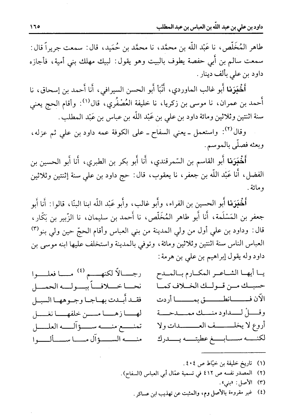 طاهر المخلص نا عبد الله بن محمد نا محمد بن حميد قال سمعت جريرا قال سمعت سالم بن أبي حفصة يطوف بالبيت وهو يقول لبيك مهلك بني أمية فأجازه داود بن علي بألف دينار أخبرنا أبو غالب الماوردي أنبأ أبو الحسن السيرافي أنا أحمد بن إسحاق نا أحمد بن عمران نا موسى بن زكريا نا خليفة العصفري قال (1) وأقام الحج يعني سنة اثنتين وثلاثين ومائة داود بن علي بن عبد الله بن عباس بن عبد المطلب وقال (2) واستعمل يعني السفاح على الكوفة عمه داود بن علي ثم عزله وبعثه فصلى بالموسم أخبرنا أبو القاسم بن السمرقندي أنا أبو بكر بن الطبري أنا أبو الحسين بن الفضل أنا عبد الله بن جعفر نا يعقوب قال حج داود بن علي سنة اثنتين وثلاثين ومائة أخبرنا أبو الحسين بن الفراء وأبو غالب وأبو عبد الله ابنا البنا قالوا أنا أبو جعفر بن المسلمة أنا أبو طاهر المخلص نا أحمد بن سليمان نا الزبير بن بكار قال وداود بن علي أول من ولي المدينة من بني العباس وأقام الحج حين ولي بنو (3) العباس الناس سنة اثنتين وثلاثين ومائة وتوفي بالمدينة واستخلف عليها ابنه موسى بن داود وله يقول إبراهيم بن علي بن هرمة يا أيها الشاعر المكارم بالمدح * رجالا لكنهم (4) ما فعلوا حسبك من قولك الخلاف كما * نحا خلافا ببوله الحمل الآن فانطق بما أردت * فقد أبدت بهاجا وجوهها السبل وقل لداود منك ممدحة * لها زها من خلفها نغل أروع لا يخلف العدات ولا * تمنع منه سؤاله العلل لكنه سابغ عطيته يدرك * منه السؤال ما سألوا