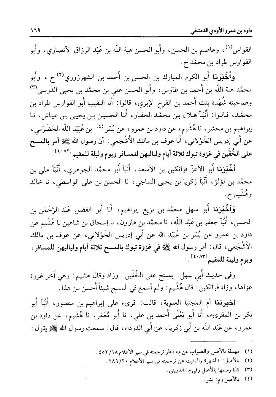 القواس (1) وعاصم بن الحسن وأبو الحسن هبة الله بن عبد الرزاق الأنصاري وأبو الفوارس طراد بن محمد وأخبرنا أبو الكرم المبارك بن الحسن بن أحمد بن الشهرزوري (2) وأبو محمد هبة الله بن أحمد بن طاوس وأبو الحسن علي بن محمد بن يحيى الدرسي (3) وصاحبته شهدة بنت أحمد بن الفرج الإبري قالوا أنا النقيب أبو الفوارس طراد بن محمد قالوا أنبأ هلال بن محمد الحفار أنا الحسين بن يحيى بن عياش نا إبراهيم بن محشر نا هشيم عن داود بن عمرو عن بسر (4) بن عبيد الله الحضرمي عن أبي إدريس الخولاني أنا عوف بن مالك الأشجعي أن رسول الله (صلى الله عليه وسلم) أمر بالمسح على الخفين في غزوة تبوك ثلاثة أيام ولياليهن للمسافر ويوم وليلة للمقيم أخبرنا أبو الأعز قراتكين بن الأسعد أنبأ أبو محمد الجوهري أنبأ علي بن محمد بن لؤلؤ أنبأ زكريا بن يحيى الساجي نا الحسن بن علي الواسطي نا خالد وهشيم وأخبرنا أبو سهل محمد بن بزيع إبراهيم أنا أبو الفضل عبد الرحمن بن الحسن أنبأ جعفر بن عبد الله نا محمد بن هارون نا إسحاق بن شاهين نا هشيم عن داود بن عمرو عن بسر بن عبيد الله عن أبي إدريس الخولاني عن عوف بن مالك الأشجعي قال أمر رسول الله (صلى الله عليه وسلم) في غزوة تبوك بالمسح ثلاثة أيام ولياليهن للمسافر ويوم وليلة للمقيم وفي حديث أبي سهل يمسح على الخفين وزاد وقال هشيم وهي آخر غزوة غزاها وزاد قراتكين قال هشيم ولم أسمع في المسح شيئا أحسن من هذا أخبرتنا أم المجتبا العلوية قالت قرئ على إبراهيم بن منصور أنبأ أبو بكر بن المقرئ أنا أبو يعلى أحمد بن علي نا أبو معمر نا هشيم عن داود بن عمرو عن عبد الله بن أبي زكريا عن أبي الدرداء قال سمعت رسول الله (صلى الله عليه وسلم) يقول