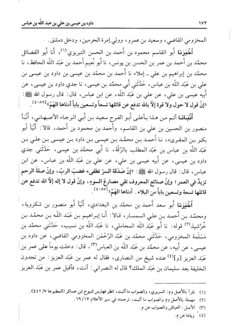 المخزومي القاضي وسعيد بن عمرو وولي إمرة الحرمين ودخل دمشق أخبرنا أبو القاسم محمود بن أحمد بن الحسن التبريزي (1) أنا أبو الفضائل محمد بن أحمد بن عمر بن الحسن بن يونس نا أبو نعيم أحمد بن عبد الله الحافظ نا محمد بن إبراهيم بن علي إملاء نا أحمد بن محمد بن عيسى بن داود بن عيسى بن علي بن عبد الله بن عباس حدثني أبي محمد بن عيسى نا جدي داود بن عيسى عن أبيه عيسى بن علي عن علي بن عبد الله عن ابن عباس قال قال رسول الله (صلى الله عليه وسلم) إن قول لا حول ولا قوة إلا بالله تدفع عن قائلها تسعا وتسعين بابا أدناها الهم أنبأنا أتم من هذا بأعلى أبو الفرح سعيد بن أبي الرجاء الأصبهاني أنبأ منصور بن الحسين بن علي بن القاسم وأحمد بن محمود بن أحمد قالا أنبأ أبو بكر بن المقرئ نا أحمد بن محمد بن عيسى بن داود بن عيسى بن علي بن عبد الله بن عباس بن عبد المطلب بالرقة نا أبي محمد بن عيسى حدثني جدي داود بن عيسى عن أبيه عيسى بن علي عن علي بن عبد الله بن عباس عن ابن عباس قال قال رسول الله (صلى الله عليه وسلم) إن صدقة السر تطفئ غضب الرب وإن صلة الرحم تزيد في العمر وإن صنائع المعروف تقي مصارع السوء وإن قول لا إله إلا الله تدفع عن قائلها تسعة وتسعين بابا من البلاء أدناها الهم أخبرنا أبو سعد أحمد بن محمد بن البغدادي أنبأ أبو منصور بن شكروية ومحمد بن أحمد بن علي السمسار قالا أنا إبراهيم بن عبد الله بن محمد بن خرشيذ (2) قوله نا أبو عبد الله المحاملي نا عبد الله بن نسيب حدثني محمد بن مسلمة المخزومي حدثني محمد بن عبد الرحمن المخزومي القاضي عن داود بن عيسى عن أبيه عن محمد بن عبد الله بن العباس (3) قال دخلت يوما على عمر بن عبد العزيز و (4) عنده شيخ من النصارى فقال له عمر بن عبد العزيز من تجدون الخليفة بعد سليمان بن عبد الملك قال له النصراني أنت فأقبل عمر بن عبد العزيز