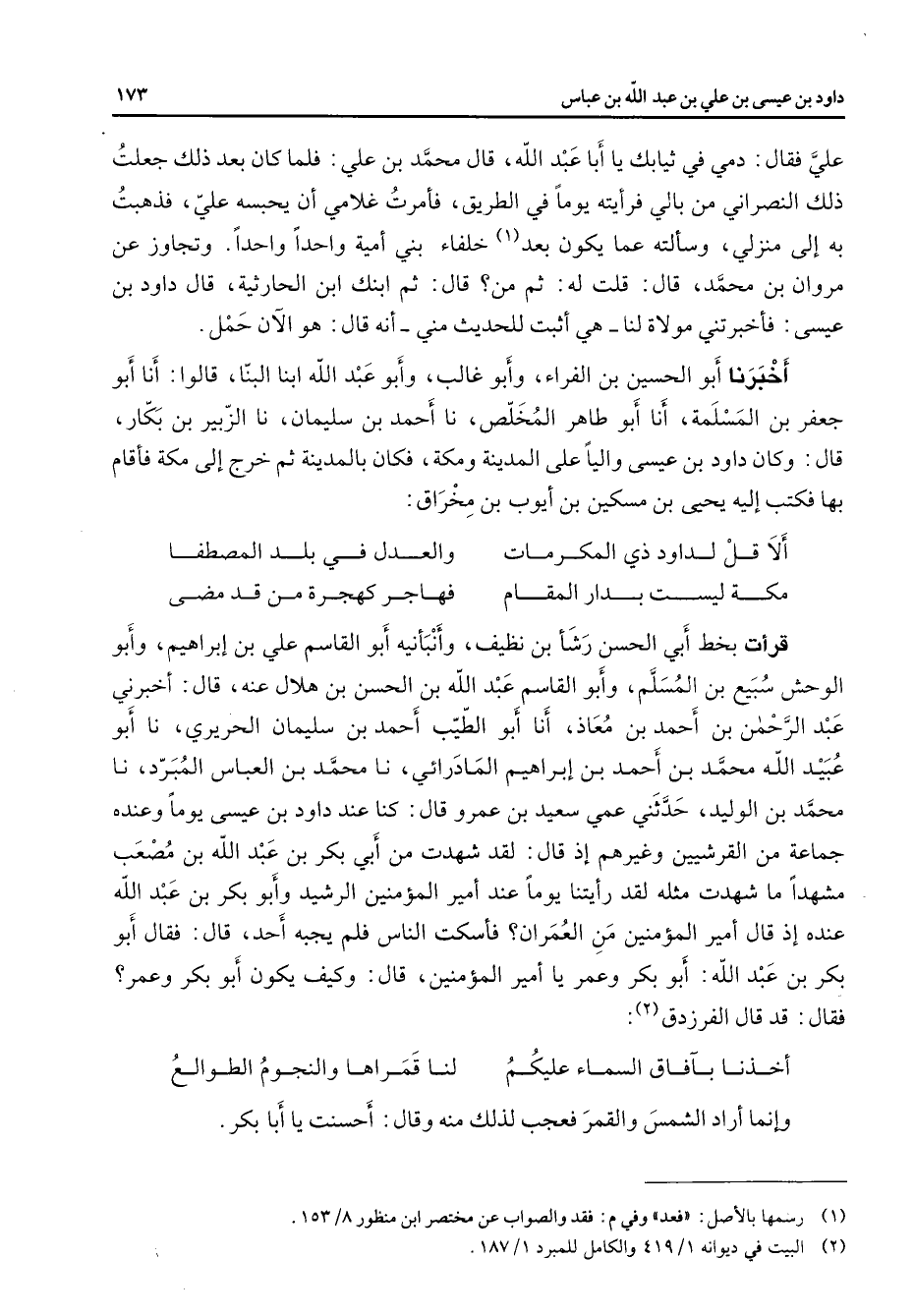 علي فقال دمي في ثيابك يا أبا عبد الله قال محمد بن علي فلما كان بعد ذلك جعلت ذلك النصراني من بالي فرأيته يوما في الطريق فأمرت غلامي أن يحبسه علي فذهبت به إلى منزلي وسألته عما يكون بعد (1) خلفاء بني أمية واحدا واحدا وتجاوز عن مروان بن محمد قال قلت له ثم من قال ثم ابنك ابن الحارثية قال داود بن عيسى فأخبرتني مولاة لنا هي أثبت للحديث مني أنه قال هو الآن حمل أخبرنا أبو الحسين بن الفراء وأبو غالب وأبو عبد الله ابنا البنا قالوا أنا أبو جعفر بن المسلمة أنا أبو طاهر المخلص نا أحمد بن سليمان نا الزبير بن بكار قال وكان داود بن عيسى واليا على المدينة ومكة فكان بالمدينة ثم خرج إلى مكة فأقام بها فكتب إليه يحيى بن مسكين بن أيوب بن مخراق * ألا قل لداود ذي المكرمات * والعدل في بلد المصطفا مكة ليست بدار المقام * فهاجر كهجرة من قد مضى * قرأت بخط أبي الحسن رشأ بن نظيف وأنبأنيه أبو القاسم علي بن إبراهيم وأبو الوحش سبيع بن المسلم وأبو القاسم عبد الله بن الحسن بن هلال عنه قال أخبرني عبد الرحمن بن أحمد بن معاذ أنا أبو الطيب أحمد بن سليمان الحريري نا أبو عبيد الله محمد بن أحمد بن إبراهيم المادرائي نا محمد بن العباس المبرد نا محمد بن الوليد حدثني عمي سعيد بن عمرو قال كنا عند داود بن عيسى يوما وعنده جماعة من القرشيين وغيرهم إذ قال لقد شهدت من أبي بكر بن عبد الله بن مصعب مشهدا ما شهدت مثله لقد رأيتنا يوما عند أمير المؤمنين الرشيد وأبو بكر بن عبد الله عنده إذ قال أمير المؤمنين من العمران فأسكت الناس فلم يجبه أحد قال فقال أبو بكر بن عبد الله أبو بكر وعمر يا أمير المؤمنين قال وكيف يكون أبو بكر وعمر فقال قد قال الفرزدق (2) * أخذنا بآفاق السماء عليكم * لنا قمراها والنجوم الطوالع * وإنما أراد الشمس والقمر فعجب لذلك منه وقال أحسنت يا أبا بكر