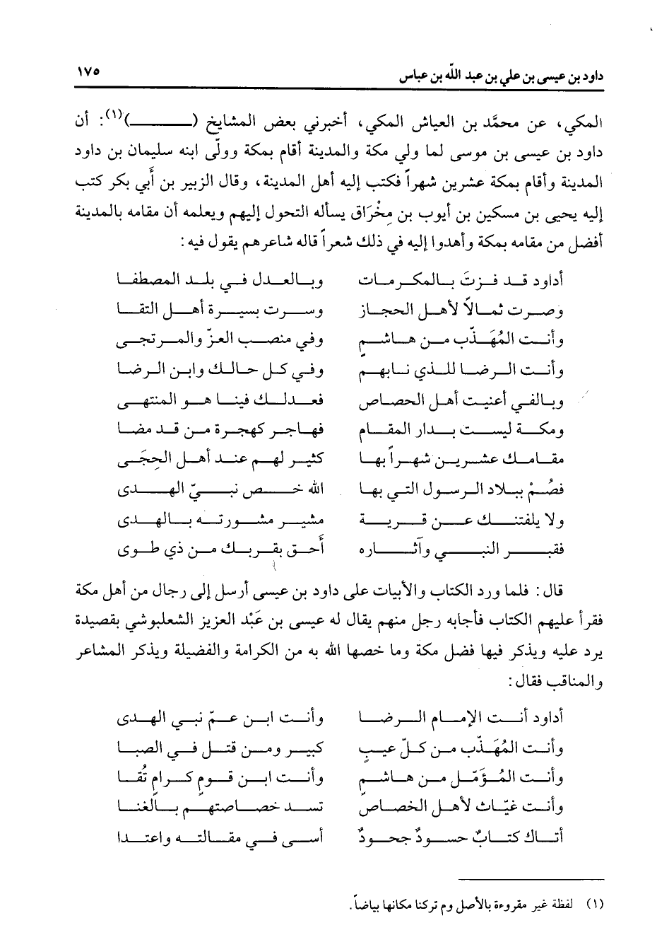 المكي عن محمد بن العياش المكي أخبرني بعض المشايخ (1) أن داود بن عيسى بن موسى لما ولي مكة والمدينة أقام بمكة وولى ابنه سليمان بن داود المدينة وأقام بمكة عشرين شهرا فكتب إليه أهل المدينة وقال الزبير بن أبي بكر كتب إليه يحيى بن مسكين بن أيوب بن مخراق يسأله التحول إليهم ويعلمه أن مقامه بالمدينة أفضل من مقامه بمكة وأهدوا إليه في ذلك شعرا قاله شاعرهم يقول فيه أداود قد فزت بالمكرمات * وبالعدل في بلد المصطفا وصرت ثمالا لأهل الحجاز * وسرت بسيرة أهل التقا وأنت المهذب من هاشم * وفي منصب العز والمرتجى وأنت الرضا للذي نابهم * وفي كل حالك وابن الرضا * * وبألفي أعنيت أهل الحصاص * فعدلك فينا هو المنتهى ومكة ليست بدار المقام * فهاجر كهجرة من قد مضا مقامك عشرين شهرا بها * كثير لهم عند أهل الحجى فصم ببلاد الرسول التي بها * الله خص نبي الهدى ولا يلفتنك عن قرية * مشير مشورته بالهدى فقبر النبي وآثاره * أحق بقربك من ذي طوى * قال فلما ورد الكتاب والأبيات على داود بن عيسى أرسل إلى رجال من أهل مكة فقرأ عليهم الكتاب فأجابه رجل منهم يقال له عيسى بن عبد العزيز الشعلبوشي بقصيدة يرد عليه ويذكر فيها فضل مكة وما خصها الله به من الكرامة والفضيلة ويذكر المشاعر والمناقب فقال * أداود أنت الإمام الرضا * وأنت ابن عم نبي الهدى وأنت المهذب من كل عيب * كبير ومن قتل في الصبا وأنت المؤمل من هاشم * وأنت ابن قوم كرام تقا وأنت غياث لأهل الخصاص * تسد خصاصتهم بالغنا أتاك كتاب حسود جحود * أسى في مقالته واعتدا