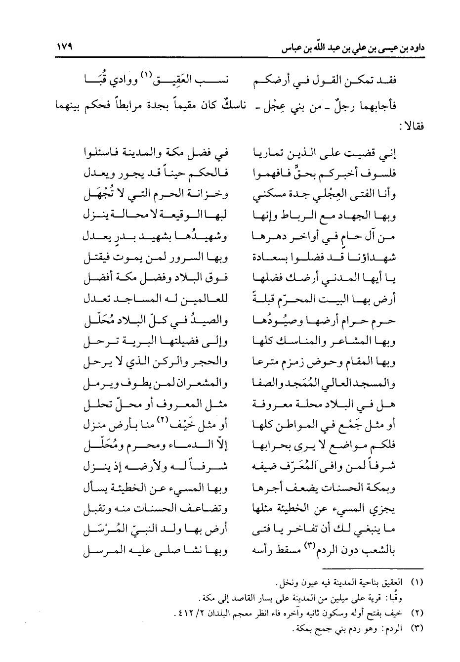 فقد تمكن القول في أرضكم * نسب العقيق (1) ووادي قبا * فأجابهما رجل من بني عجل ناسك كان مقيما بجدة مرابطا فحكم بينهما فقالا * إن قضيت على الذين تماريا * في فضل مكة والمدينة فاسئلوا فلسوف أخبركم بحق فافهموا * فالحكم حينا قد يجور ويعدل وأنا الفتى العجلي جدة مسكني * وخزانة الحرم التي لا تجهل * * وبها الجهاد مع الرباط وإنها * لبها الوقيعة لا محالة ينزل من آل حام في أواخر دهرها * وشهيدها بشهيد بدر يعدل شهداؤنا قد فضلوا بسعادة * وبها السرور لمن يموت فيقتل يا أيها المدني أرضك فضلها * فوق البلاد وفضل مكة أفضل أرض بها البيت المحرم قبلة * للعالمين له المساجد تعدل حرم حرام أرضها وصيودها * والصيد في كل البلاد محلل وبها المشاعر والمناسك كلها * وإلى فضيلتها البرية ترحل وبها المقام وحوض زمزم مترعا * والحجر والركن الذي لا يرحل والمسجد العالي الممجد والصفا * والمشعران لمن يطوف ويرمل هل في البلاد محلة معروفة * مثل المعروف أو محل تحلل أو مثل جمع في المواطن كلها * أو مثل خيف (2) منا بأرض منزل فلكم مواضع لا يرى بحرابها * إلا الدماء ومحرم ومحلل شرفا لمن وافى المعرف ضيفه * شرفا له ولأرضه إذ ينزل وبمكة الحسنات يضعف أجرها * وبها المسئ عن الخطيئة يسأل يجزي المسئ عن الخطيئة مثلها * وتضاعف الحسنات منه وتقبل * * ما ينبغي لك أن تفاخر يا فتى * أرض بها ولد النبي المرسل بالشعب دون الردم (3) مسقط رأسه * وبها نشا صلى عليه المرسل