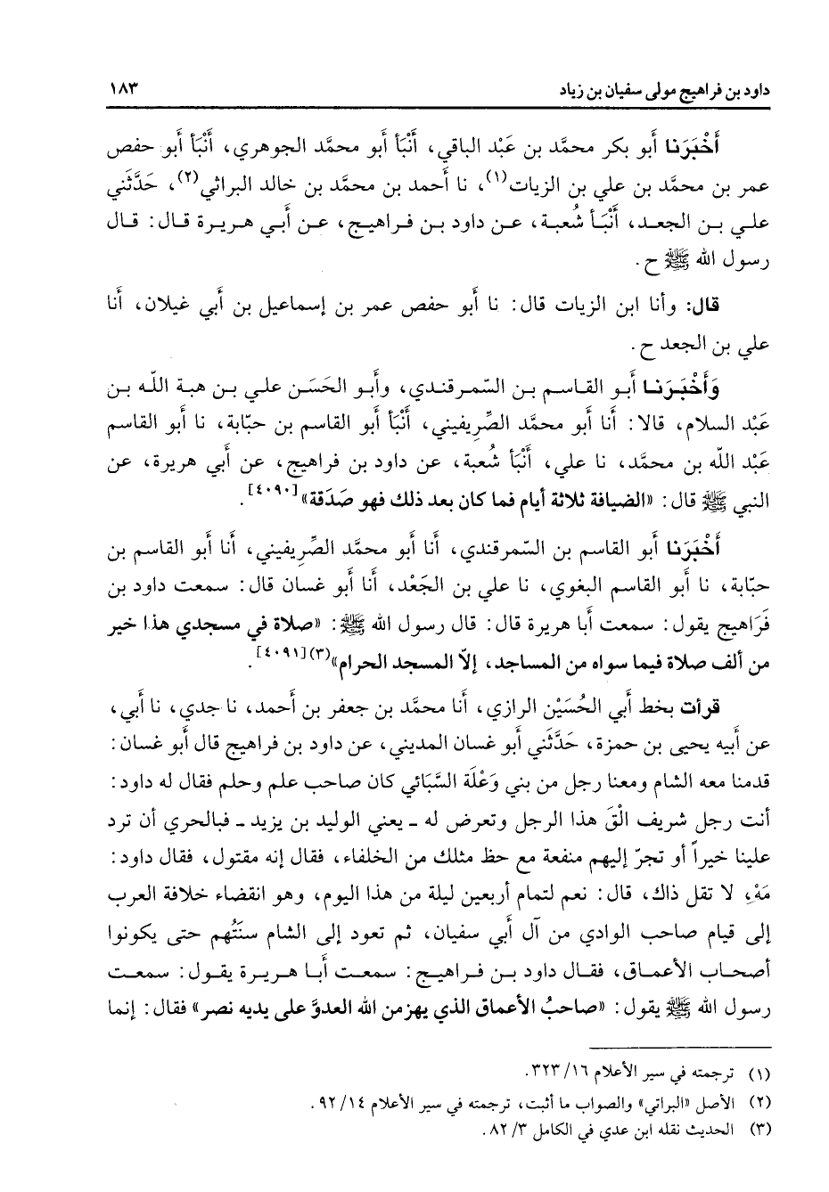 أخبرنا أبو بكر محمد بن عبد الباقي أنبأ أبو محمد الجوهري أنبأ أبو حفص عمر بن محمد بن علي بن الزيات (1) نا أحمد بن محمد بن خالد البراثي (2) حدثني علي بن الجعد أنبأ شعبة عن داود بن فراهيج عن أبي هريرة قال قال رسول الله (صلى الله عليه وسلم) قال وأنا ابن الزيات قال نا أبو حفص عمر بن إسماعيل بن أبي غيلان أنا علي بن الجعد وأخبرنا أبو القاسم بن السمرقندي وأبو الحسن علي بن هبة الله بن عبد السلام قالا أنا أبو محمد الصريفيني أنبأ أبو القاسم بن حبابة نا أبو القاسم عبد الله بن محمد نا علي أنبأ شعبة عن داود بن فراهيج عن أبي هريرة عن النبي (صلى الله عليه وسلم) قال الضيافة ثلاثة أيام فما كان بعد ذلك فهو صدقة أخبرنا أبو القاسم بن السمرقندي أنا أبو محمد الصريفيني أنا أبو القاسم بن حبابة نا أبو القاسم البغوي نا علي بن الجعد أنا أبو غسان قال سمعت داود بن فراهيج يقول سمعت أبا هريرة قال قال رسول الله (صلى الله عليه وسلم) صلاة في مسجدي هذا خير من ألف صلاة فيما سواه من المساجد إلا المسجد الحرام (3) قرأت بخط أبي الحسين الرازي أنا محمد بن جعفر بن أحمد نا جدي نا أبي عن أبيه يحيى بن حمزة حدثني أبو غسان المديني عن داود بن فراهيج قال أبو غسان قدمنا معه الشام ومعنا رجل من بني وعلة السبائي كان صاحب علم وحلم فقال له داود أنت رجل شريف الق هذا الرجل وتعرض له يعني الوليد بن يزيد فبالحري أن ترد علينا خيرا أو تجر إليهم منفعة مع حظ مثلك من الخلفاء فقال إنه مقتول فقال داود مه لا تقل ذاك قال نعم لتمام أربعين ليلة من هذا اليوم وهو انقضاء خلافة العرب إلى قيام صاحب الوادي من آل أبي سفيان ثم تعود إلى الشام سنتهم حتى يكونوا أصحاب الأعماق فقال داود بن فراهيج سمعت أبا هريرة يقول سمعت رسول الله (صلى الله عليه وسلم) يقول صاحب الأعماق الذي يهز من الله العدو على يديه نصر فقال إنما