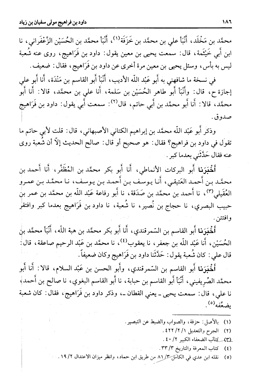 مخلد أنبأ علي بن محمد بن خزفة (1) أنبأ محمد بن الحسين الزعفراني نا ابن أبي خيثمة قال سمعت يحيى بن معين يقول داود بن فراهيج روى عنه شعبة ليس به بأس وسئل يحيى بن معين مرة أخرى عن داود بن فراهيج فقال ضعيف في نسخة ما شافهني به أبو عبد الله الأديب أنبأ أبو القاسم بن مندة أنا أبو علي إجازة قال وأنبأ أبو طاهر الحسين بن سلمة أنا علي بن محمد قالا أنا أبو محمد قالا أنا أبو محمد بن أبي حاتم قال (2) سمعت أبي يقول داود بن فراهيج صدوق وذكر أبو عبد الله محمد بن إبراهيم الكتاني الأصبهاني قال قلت لأبي حاتم ما تقول في داود بن فراهيج فقال هو صحيح أو قال صالح الحديث إلا أن شعبة روى عنه فقال حدثني بعدما كبر أخبرنا أبو البركات الأنماطي أنا أبو بكر محمد بن المظفر أنا أحمد بن محمد بن أحمد العتيقي أنا يوسف بن أحمد بن يوسف نا محمد بن عمرو العقيلي (3) نا أحمد بن محمد بن صدقة نا أبو رفاعة عبد الله بن محمد بن عمر بن حبيب البصري نا حجاج بن نصير نا شعبة نا داود بن فراهيج بعدما كبر وافتقر وافتتن أخبرنا أبو القاسم بن السمرقندي أنا أبو بكر محمد بن هبة الله أنبأ محمد بن الحسين أنا عبد الله بن جعفر نا يعقوب (4) نا محمد بن عبد الرحيم صاعقة قال قال علي كان شعبة يقول حدثنا داود بن فراهيج وكان ضعيفا أخبرنا أبو القاسم بن السمرقندي وأبو الحسن بن عبد السلام قالا أنا أبو محمد الصريفيني أنبأ أبو القاسم بن حبابة نا أبو القاسم البغوي نا صالح بن أحمد نا علي قال سمعت يحيى يعني القطان وذكر داود بن فراهيج فقال كان شعبة يضعفه (5)
