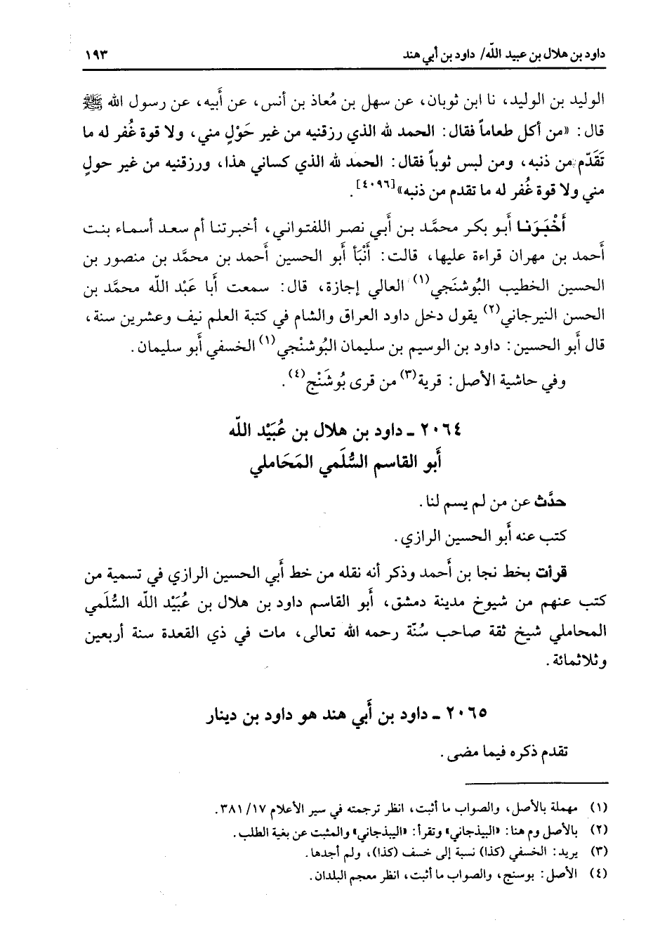 الوليد بن الوليد نا ابن ثوبان عن سهل بن معاذ بن أنس عن أبيه عن رسول الله (صلى الله عليه وسلم) قال من أكل طعاما فقال الحمد لله الذي رزقنيه من غير حول مني ولا قوة غفر له ما تقدم من ذنبه ومن لبس ثوبا فقال الحمد لله الذي كساني هذا ورزقنيه من غير حول مني ولا قوة غفر له ما تقدم من ذنبه أخبرنا أبو بكر محمد بن أبي نصر اللفتواني أخبرتنا أم سعد أسماء بنت أحمد بن مهران قراءة عليها قالت أنبأ أبو الحسين أحمد بن محمد بن منصور بن الحسين الخطيب البوشنجي (1) العالي إجازة قال سمعت أبا عبد الله محمد بن الحسن النيرجاني (2) يقول دخل داود العراق والشام في كتبة العلم نيف وعشرين سنة قال أبو الحسين داود بن الوسيم بن سليمان البوشنجي (1) الخسفي أبو سليمان وفي حاشية الأصل قرية (3) من قرى بوشنج (4)