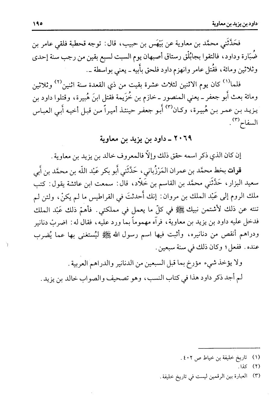 2069 - داود بن يزيد بن معاوية إن كان الذي ذكر اسمه حقق ذلك وإلا فالمعروف خالد بن يزيد بن معاوية قرأت بخط محمد بن عمران المرزباني حدثني أبو بكر عبد الله بن محمد بن أبي سعيد البزار حدثني محمد بن القاسم بن خلاد قال سمعت ابن عائشة يقول كتب ملك الروم إلى عبد الملك بن مروان إنك أحدثت في القراطيس ما لم يكن ولئن لم تنته عن ذلك لأشتمن نبيك (صلى الله عليه وسلم) في كل ما يعمل في مملكتي فأهم ذلك عبد الملك فدخل عليه داود بن يزيد بن معاوية فرآه مهموما بما ورد عليه فقال له اضرب دنانير ودراهم انقص من دنانيره وأثبت فيها اسم رسول الله (صلى الله عليه وسلم) ليستغني بها عما يضرب عنده ففعل وكان ذلك في سنة سبعين ولا يؤخذ شئ مؤرخ بما قبل السبعين من الدنانير والدراهم العربية لم أجد ذكر داود هذا في كتاب النسب وهو تصحيف والصواب خالد بن يزيد "