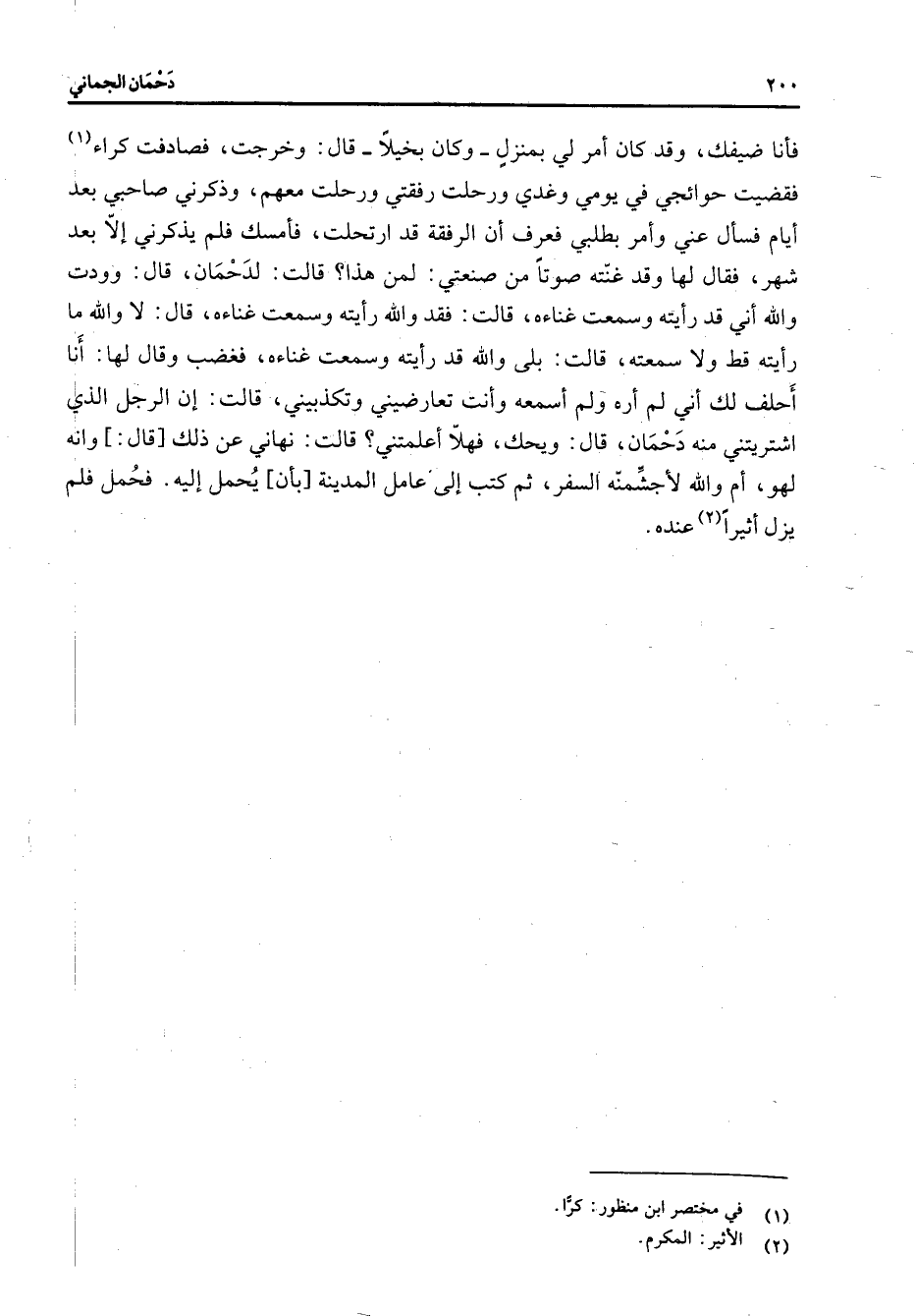 فأنا ضيفك وقد كان أمر لي بمنزل وكان بخيلا قال وخرجت فصادفت كراء (1) فقضيت حوائجي في يومي وغدي ورحلت رفقتي ورحلت معهم وذكرني صاحبي بعد أيام فسأل عني وأمر بطلبي فعرف أن الرفقة قد ارتحلت فأمسك فلم يذكرني إلا بعد شهر فقال لها وقد غنته صوتا من صنعتي لمن هذا قالت لدحمان قال وودت والله أني قد رأيته وسمعت غناءه قالت فقد والله رأيته وسمعت غناءه قال لا والله ما رأيته قط ولا سمعته قالت بلى والله قد رأيته وسمعت غناءه فغضب وقال لها أنا أحلف لك أني لم أره ولم أسمعه وأنت تعارضيني وتكذبيني قالت إن الرجل الذي اشتريتني منه دحمان قال ويحك فهلا أعلمتني قالت نهاني عن ذلك قال وإنه لهو أم والله لأجشمنه السفر ثم كتب إلى عامل المدينة بأن يحمل إليه فحمل فلم يزل أثيرا (2) عنده "
