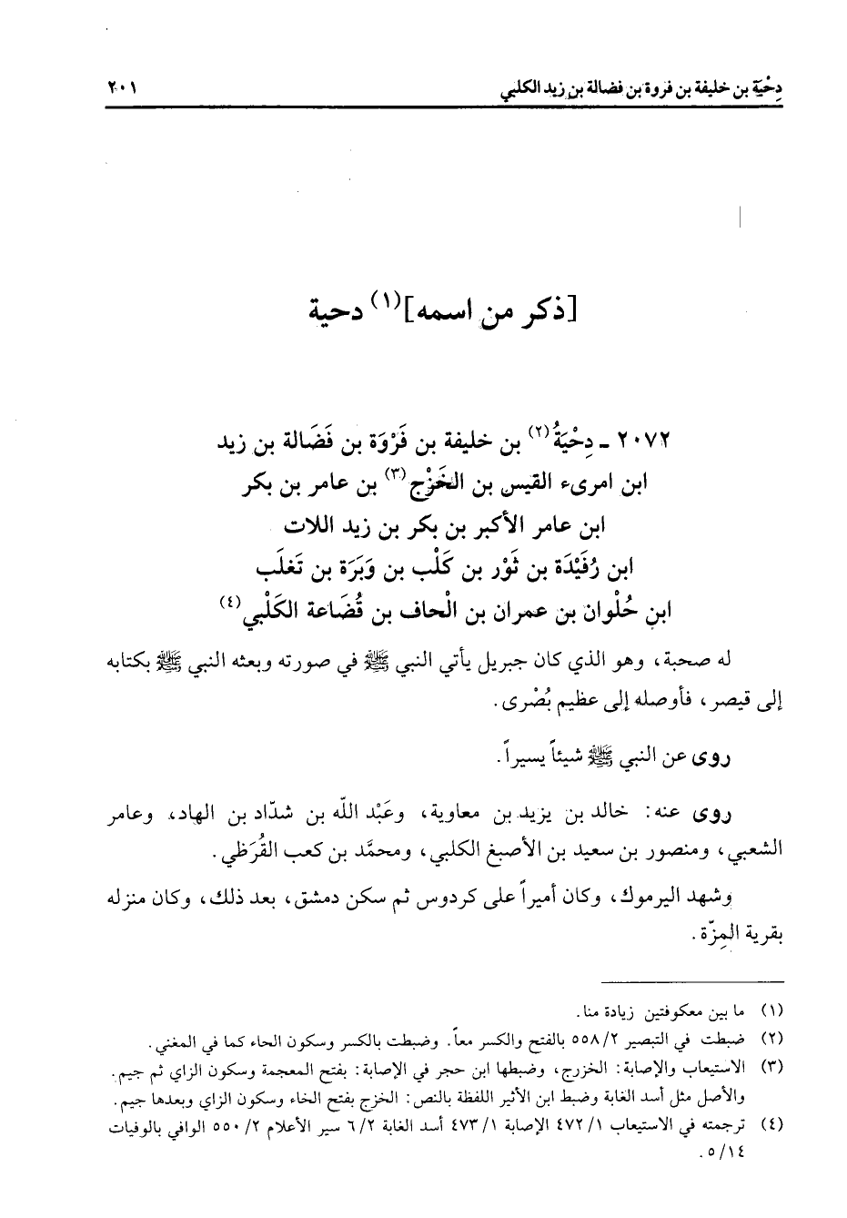 ذكر من اسمه (1) دحية " 2072 دحية (2) بن خليفة بن فروة بن فضالة بن زيد ابن امرئ القيس بن الخزج (3) بن عامر بن بكر ابن عامر الأكبر بن بكر بن زيد اللات ابن رفيدة بن ثور بن كلب بن وبرة بن تغلب ابن حلوان بن عمران بن الحاف بن قضاعة الكلبي (4) له صحبة وهو الذي كان جبريل يأتي النبي (صلى الله عليه وسلم) في صورته وبعثه النبي (صلى الله عليه وسلم) بكتابه إلى قيصر فأوصله إلى عظيم بصرى روى عن النبي (صلى الله عليه وسلم) شيئا يسيرا روى عنه خالد بن يزيد بن معاوية وعبد الله بن شداد بن الهاد وعامر الشعبي ومنصور بن سعيد بن الأصبغ الكلبي ومحمد بن كعب القرظي وشهد اليرموك وكان أميرا على كردوس ثم سكن دمشق بعد ذلك وكان منزله بقرية المزة
