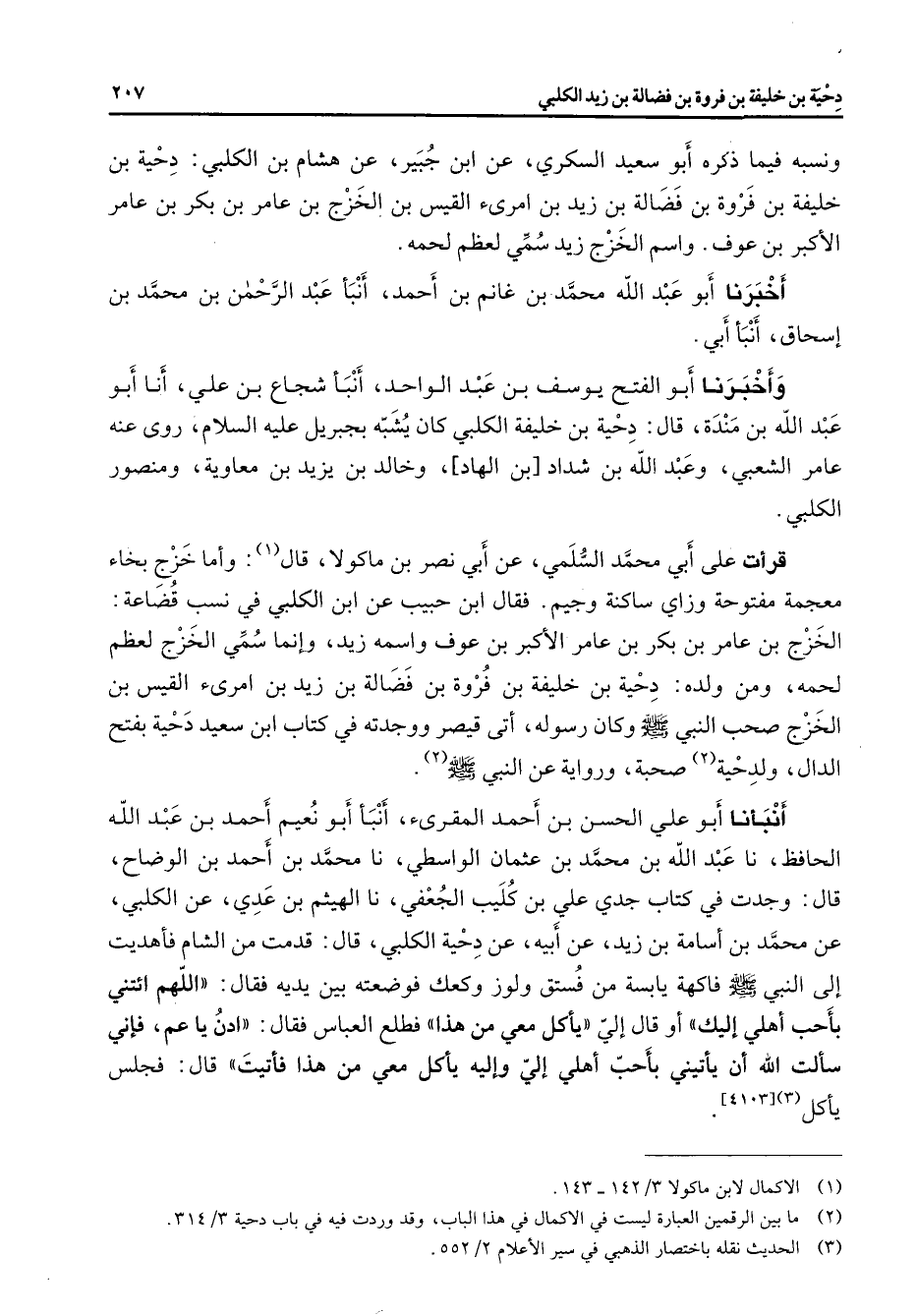 (2) ما بين الرقمين العبارة ليست في الاكمال في هذا الباب وقد وردت فيه في باب دحية 3 / 314