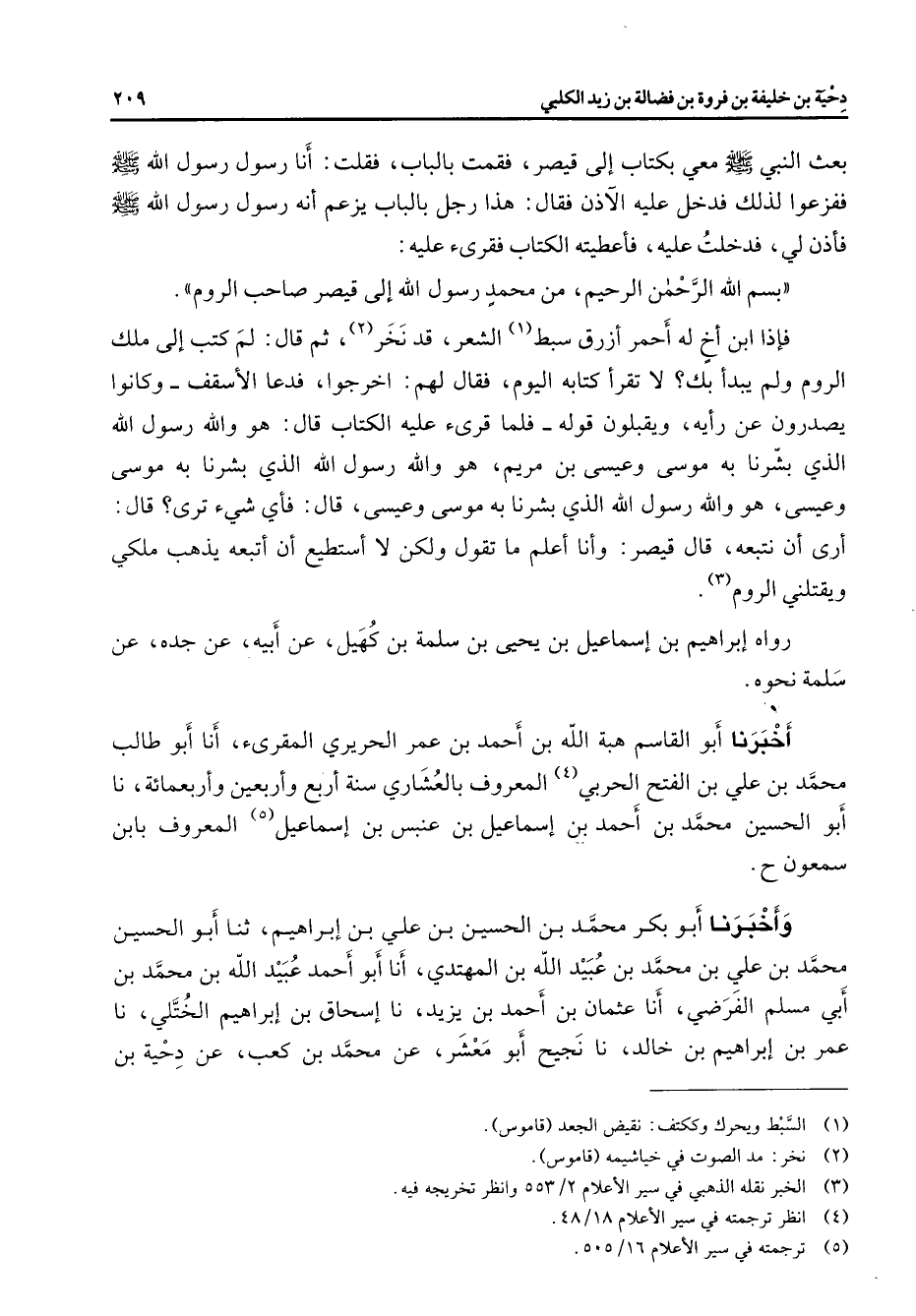 بعث النبي (صلى الله عليه وسلم) معي بكتاب إلى قيصر فقمت بالباب فقلت أنا رسول رسول الله (صلى الله عليه وسلم) ففزعوا لذلك فدخل عليه الآذن فقال هذا رجل بالباب يزعم أنه رسول رسول الله (صلى الله عليه وسلم) فأذن لي فدخلت عليه فأعطيته الكتاب فقرئ عليه بسم الله الرحمن الرحيم من محمد رسول الله إلى قيصر صاحب الروم فإذا ابن أخ له أحمر أزرق سبط (1) الشعر قد نخر (2) ثم قال لم كتب إلى ملك الروم ولم يبدأ بك لا تقرأ كتابه اليوم فقال لهم اخرجوا فدعا الأسقف وكانوا يصدرون عن رأيه ويقبلون قوله فلما قرئ عليه الكتاب قال هو والله رسول الله الذي بشرنا به موسى وعيسى بن مريم هو والله رسول الله الذي بشرنا به موسى وعيسى هو والله رسول الله الذي بشرنا به موسى وعيسى قال فأي شئ ترى قال أرى أن نتبعه قال قيصر وأنا أعلم ما تقول ولكن لا أستطيع أن أتبعه يذهب ملكي ويقتلني الروم (3) رواه إبراهيم بن إسماعيل بن يحيى بن سلمة بن كهيل عن أبيه عن جده عن سلمة نحوه أخبرنا أبو القاسم هبة الله بن أحمد بن عمر الحريري المقرئ أنا أبو طالب محمد بن علي بن الفتح الحربي (4) المعروف بالعشاري سنة أربع وأربعين وأربعمائة نا أبو الحسين محمد بن أحمد بن إسماعيل بن عنبس بن إسماعيل (5) المعروف بابن سمعون وأخبرنا أبو بكر محمد بن الحسين بن علي بن إبراهيم ثنا أبو الحسين محمد بن علي بن محمد بن عبيد الله بن المهتدي أنا أبو أحمد عبيد الله بن محمد بن أبي مسلم الفرضي أنا عثمان بن أحمد بن يزيد نا إسحاق بن إبراهيم الختلي نا عمر بن إبراهيم بن خالد نا نجيح أبو معشر عن محمد بن كعب عن دحية بن