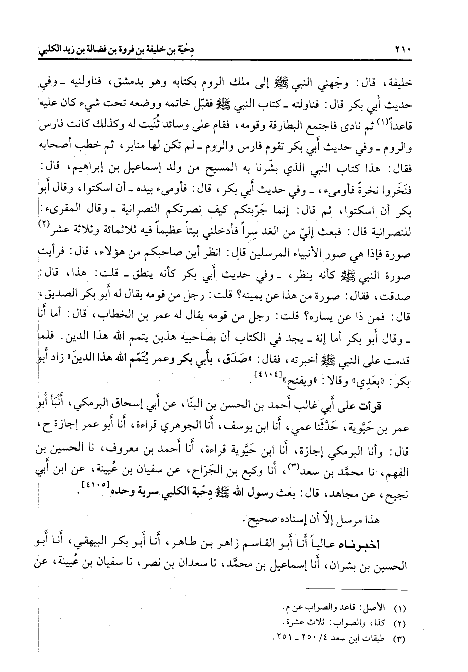 خليفة قال وجهني النبي (صلى الله عليه وسلم) إلى ملك الروم بكتابه وهو بدمشق فناولنيه وفي حديث أبي بكر قال فناولته كتاب النبي (صلى الله عليه وسلم) فقبل خاتمه ووضعه تحت شئ كان عليه قاعدا (1) ثم نادى فاجتمع البطارقة وقومه فقام على وسائد ثنيت له وكذلك كانت فارس والروم وفي حديث أبي بكر تقوم فارس والروم لم تكن لها منابر ثم خطب أصحابه فقال هذا كتاب النبي الذي بشرنا به المسيح من ولد إسماعيل بن إبراهيم قال فنخروا نخرة فأومئ وفي حديث أبي بكر قال فأومئ بيده أن اسكتوا وقال أبو بكر أن اسكتوا ثم قال إنما جربتكم كيف نصرتكم النصرانية وقال المقرئ للنصرانية قال فبعث إلي من الغد سرا فأدخلني بيتا عظيما فيه ثلاثمائة وثلاثة عشر (2) صورة فإذا هي صور الأنبياء المرسلين قال انظر أين صاحبكم من هؤلاء قال فرأيت صورة النبي (صلى الله عليه وسلم) كأنه ينظر وفي حديث أبي بكر كأنه ينطق قلت هذا قال صدقت فقال صورة من هذا عن يمينة قلت رجل من قومه يقال له أبو بكر الصديق قال فمن ذا عن يساره قلت رجل من قومه يقال له عمر بن الخطاب قال أما أنا وقال أبو بكر أما إنه يجد في الكتاب أن بصاحبيه هذين يتمم الله هذا الدين فلما قدمت على النبي (صلى الله عليه وسلم) أخبرته فقال صدق بأبي بكر وعمر يتمم الله هذا الدين زاد أبو بكر بعدي وقالا ويفتح قرأت على أبي غالب أحمد بن الحسن بن البنا عن أبي إسحاق البرمكي أنبأ أبو عمر بن حيوية حدثنا عمي أنا ابن يوسف أنا الجوهري قراءة أنا أبو عمر إجازة قال وأنا البرمكي إجازة أنا ابن حيوية قراءة أنا أحمد بن معروف نا الحسين بن الفهم نا محمد بن سعد (3) أنا وكيع بن الجراح عن سفيان بن عيينة عن ابن أبي نجيح عن مجاهد قال بعث رسول الله (صلى الله عليه وسلم) دحية الكلبي سرية وحده هذا مرسل إلا أن إسناده صحيح أخبرناه عاليا أنا أبو القاسم زاهر بن طاهر أنا أبو بكر البيهقي أنا أبو الحسين بن بشران أنا إسماعيل بن محمد نا سعدان بن نصر نا سفيان بن عيينة عن