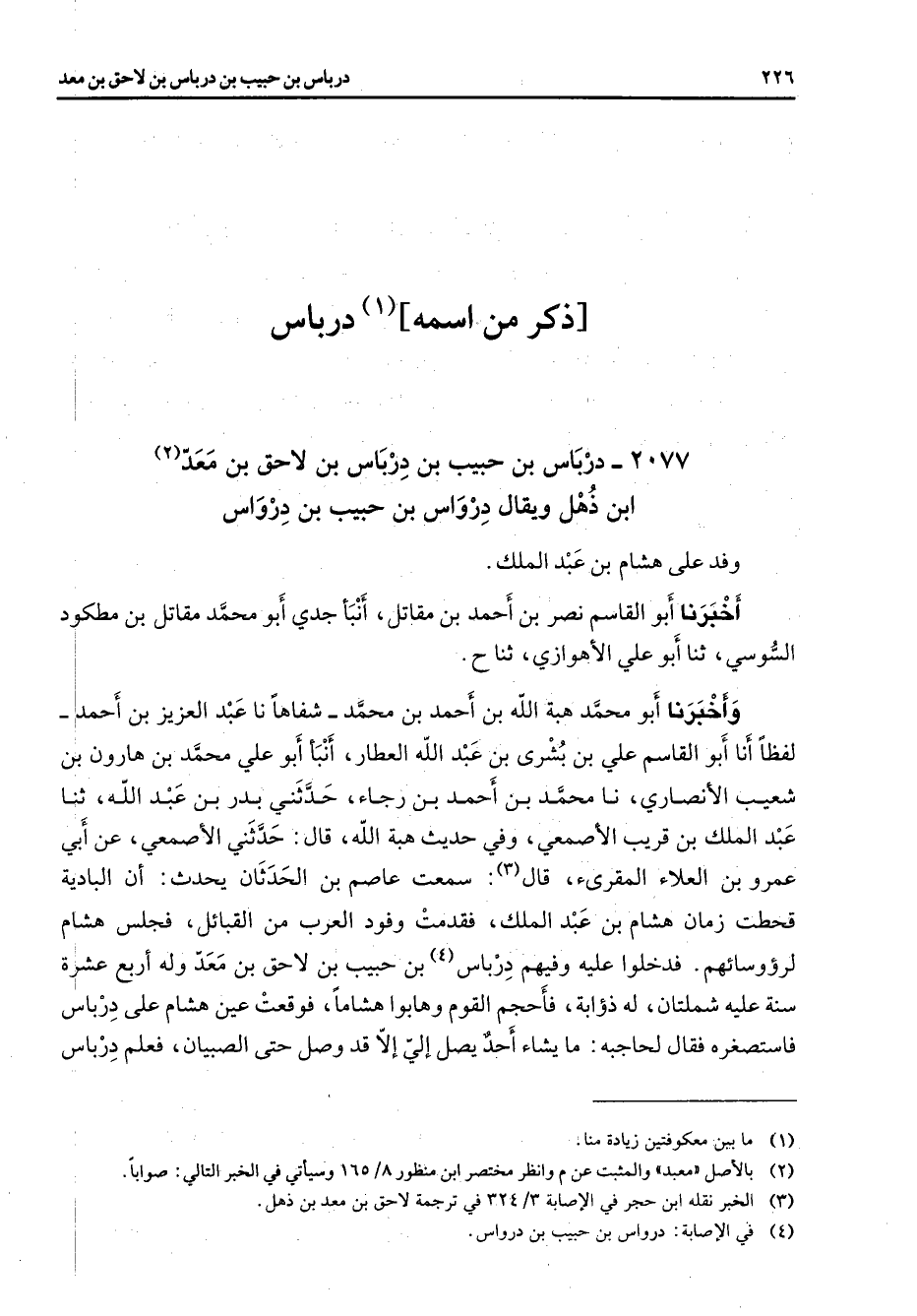 2077 - درباس بن حبيب بن درباس بن لاحق بن معد (2) ابن ذهل ويقال درواس بن حبيب بن درواس وفد على هشام بن عبد الملك أخبرنا أبو القاسم نصر بن أحمد بن مقاتل أنبأ جدي أبو محمد مقاتل بن مطكود السوسي ثنا أبو علي الأهوازي ثنا وأخبرنا أبو محمد هبة الله بن أحمد بن محمد شفاها نا عبد العزيز بن أحمد لفظا أنا أبو القاسم علي بن بشرى بن عبد الله العطار أنبأ أبو علي محمد بن هارون بن شعيب الأنصاري نا محمد بن أحمد بن رجاء حدثني بدر بن عبد الله ثنا عبد الملك بن قريب الأصمعي وفي حديث هبة الله قال حدثني الأصمعي عن أبي عمرو بن العلاء المقرئ قال (3) سمعت عاصم بن الحدثان يحدث أن البادية قحطت زمان هشام بن عبد الملك فقدمت وفود العرب من القبائل فجلس هشام لرؤوسائهم فدخلوا عليه وفيهم درباس (4) بن حبيب بن لاحق بن معد وله أربع عشرة سنة عليه شملتان له ذؤابة فأحجم القوم وهابوا هشاما فوقعت عين هشام على درباس فاستصغره فقال لحاجبه ما يشاء أحد يصل إلي إلا قد وصل حتى الصبيان فعلم درباس