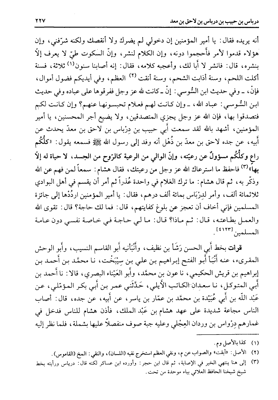أنه يريده فقال يا أمير المؤمنين إن دخولي لم يضرك ولا انقصك ولكنه شرفني وإن هؤلاء قدموا لأمر فأحجموا دونه وإن الكلام لنشر وإن السكوت طي لا يعرف إلا بنشره قال فانشر لا أبا لك وأعجبه كلامه فقال إنه أصابنا سنون (1) ثلاثة فسنة أكلت اللحم وسنة أذابة الشحم وسنة أنقت (2) العظم وفي أيديكم فضول أموال فإن وفي حديث ابن السوسي إن كانت لله عز وجل ففرقوها على عباده وفي حديث ابن السوسي عباد الله وإن كانت لهم فعلام تحبسونها عنهم وإن كانت لكم فتصدقوا بها فإن الله عز وجل يجزي المتصدقين ولا يضيع أجر المحسنين يا أمير المؤمنين أشهد بالله لقد سمعت أبي حبيب بن درباس بن لاحق بن معد يحدث عن أبيه عن جده لاحق بن معد بن ذهل أنه وفد إلى رسول الله (صلى الله عليه وسلم) فسمعه يقول كلكم راع وكلكم مسؤول عن رعيته وإن الوالي من الرعية كالروح من الجسد لا حياة له إلا بها (3) فاحفظ ما استرعاك الله عز وجل من رعيتك فقال هشام سمعا لمن فهم عن الله وذكر به ثم قال هشام ما ترك الغلام في واحدة عذرا ثم أمر أن يقسم في أهل البوادي ثلاثمائة ألف وأمر لدرباس بمائة ألف درهم فقال يا أمير المؤمنين ارددها إلى جائزة المسلمين فإني أخاف أن تعجز عن بلوغ كفايتهم قال فما لك حاجة قال تقوى الله والعمل بطاعته قال ثم ماذا قال ما لي حاجة في خاصة نفسي دون عامة المسلمين قرأت بخط أبي الحسن رشأ بن نظيف وأنبأنيه أبو القاسم النسيب وأبو الوحش المقرئ عنه أنبأ أبو الفتح إبراهيم بن علي بن سيبخت نا محمد بن أحمد بن إبراهيم بن قريش الحكيمي نا عون بن محمد وأبو العيناء البصري قالا نا أحمد بن أبي المتوكل نا سعدان الكاتب الأيلي حدثني عمر بن أبي بكر المؤملي عن عبد الله بن أبي عبيدة بن محمد بن عمار بن ياسر عن أبيه عن جده قال أصاب الناس مجاعة شديدة على عهد هشام بن عبد الملك فأذن هشام للناس فدخل في غمارهم درواس بن وردان العجلي وعليه جبة صوف منفصلا عليها بشملة فلما نظر إليه