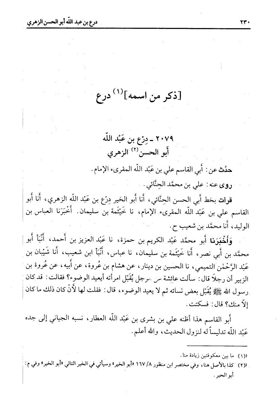 2079 - درع بن عبد الله أبو الحسن (2) الزهري حدث عن أبي القاسم علي بن عبد الله المقرئ الإمام روى عنه علي بن محمد الحنائي قرأت بخط أبي الحسن الحنائي أنا أبو الخير درع بن عبد الله الزهري أنا أبو القاسم علي بن عبد الله المقرئ الإمام نا خيثمة بن سليمان أخبرنا العباس بن الوليد أنا محمد بن شعيب وأخبرنا أبو محمد عبد الكريم بن حمزة نا عبد العزيز بن أحمد أنبأ أبو محمد بن أبي نصر أنا خيثمة بن سليمان نا عباس أنبأ ابن شعيب أنا شيبان بن عبد الرحمن التميمي نا الحسين بن دينار عن هشام بن عروة عن أبيه عن عروة بن الزبير أن رجلا قال سألت عائشة عن الرجل يقبل امرأته أيعيد الوضوء فقالت قد كان رسول الله (صلى الله عليه وسلم) يقبل بعض نسائه ثم لا يعيد الوضوء قال فقلت لها لأن كان ذلك ما كان إلا منك قال فسكتت أبو القاسم هذا أظنه علي بن بشرى بن عبد الله العطار نسبه الجياني إلى جده عبد الله تدليسا له لنزول الحديث والله أعلم "