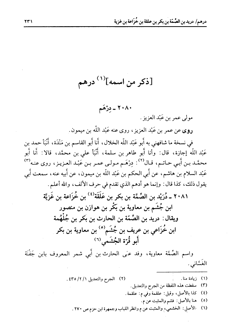 ذكر من اسمه (1) درهم " 2080 درهم مولى عمر بن عبد العزيز روى عن عمر بن عبد العزيز روى عنه عبد الله بن ميمون في نسخة ما شافهني به أبو عبد الله الخلال أنا أبو القاسم بن مندة أنبأ حمد بن عبد الله إجازة قال وأنا أبو طاهر بن سلمة أنبأ علي بن محمد قالا أنا أبو محمد بن أبي حاتم قال (2) درهم مولى عمر بن عبد العزيز روى عنه (3) عبد السلام بن هاشم عن أبي الحكم بن عبد الله بن ميمون عن أبيه عنه سمعت أبي يقول ذلك كذا قال وإنما هو أدهم الذي تقدم في حرف الألف والله أعلم