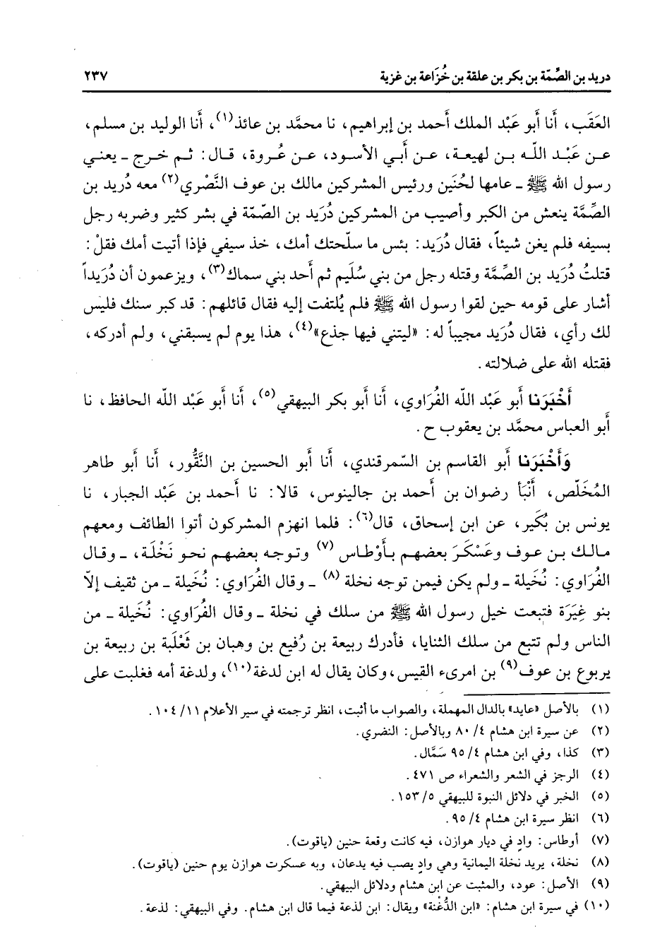 العقب أنا أبو عبد الملك أحمد بن إبراهيم نا محمد بن عائذ (1) أنا الوليد بن مسلم عن عبد الله بن لهيعة عن أبي الأسود عن عروة قال ثم خرج يعني رسول الله (صلى الله عليه وسلم) عامها لحنين ورئيس المشركين مالك بن عوف النصري (2) معه دريد بن الصمة ينعش من الكبر وأصيب من المشركين دريد بن الصمة في بشر كثير وضربه رجل بسيفه فلم يغن شيئا فقال دريد بئس ما سلحتك أمك خذ سيفي فإذا أتيت أمك فقل قتلت دريد بن الصمة وقتله رجل من بني سليم ثم أحد بني سماك (3) ويزعمون أن دريدا أشار على قومه حين لقوا رسول الله (صلى الله عليه وسلم) فلم يلتفت إليه فقال قائلهم قد كبر سنك فليس لك رأي فقال دريد مجيبا له ليتني فيها جذع (4) هذا يوم لم يسبقني ولم أدركه فقتله الله على ضلالته أخبرنا أبو عبد الله الفراوي أنا أبو بكر البيهقي (5) أنا أبو عبد الحافظ نا أبو العباس محمد بن يعقوب وأخبرنا أبو القاسم بن السمرقندي أنا أبو الحسين بن النقور أنا أبو طاهر المخلص أنبأ رضوان بن أحمد بن جالينوس قالا نا أحمد بن عبد الجبار نا يونس بن بكير عن ابن إسحاق قال (6) فلما انهزم المشركون أتوا الطائف ومعهم مالك بن عوف وعسكر بعضهم بأوطاس (7) وتوجه بعضهم نحو نخلة وقال الفراوي نخيلة ولم يكن فيمن توجه نخلة (8) وقال الفراوي نخيلة من ثقيف إلا بنو غيرة فتبعت خيل رسول الله (صلى الله عليه وسلم) من سلك في نخلة وقال الفراوي نخيلة من الناس ولم تتبع من سلك الثنايا فأدرك ربيعة بن رفيع بن وهبان بن ثعلبة بن ربيعة بن يربوع بن عوف (9) بن امرئ القيس وكان يقال له ابن لدغة ولدغه أمه فغلبت على