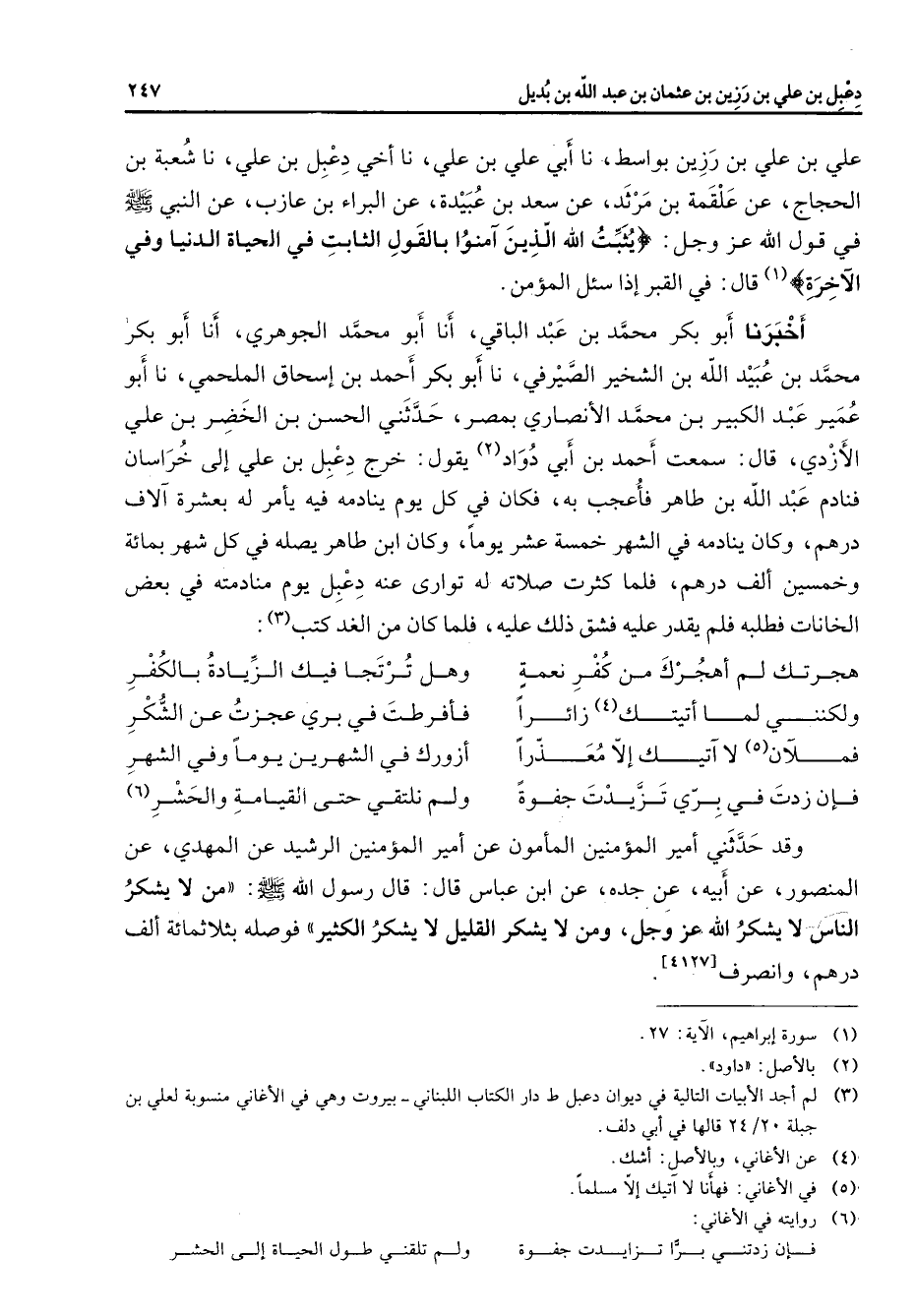 علي بن علي بن رزين بواسط نا أبي علي بن علي نا أخي دعبل بن علي نا شعبة بن الحجاج عن علقمة بن مرثد عن سعد بن عبيدة عن البراء بن عازب عن النبي (صلى الله عليه وسلم) في قول الله عز وجل " يثبت الله الذي آمنوا بالقول الثابت في الحياة الدنيا وفي الآخرة " (1) قال في القبر إذا سئل المؤمن أخبرنا أبو بكر محمد بن عبد الباقي أنا أبو محمد الجوهري أنا أبو بكر محمد بن عبيد الله بن الشخير الصيرفي نا أبو بكر أحمد بن إسحاق الملحمي نا أبو عمير عبد الكبير بن محمد الأنصاري بمصر حدثني الحسن بن الخضر بن علي الأزدي قال سمعت أحمد بن أبي دواد (2) يقول خرج دعبل بن علي إلى خراسان فنادم عبد الله بن طاهر فأعجب به فكان في كل يوم ينادمه فيه يأمر له بعشرة آلاف درهم وكان ينادمه في الشهر خمسة عشر يوما وكان ابن طاهر يصله في كل شهر بمائة وخمسين ألف درهم فلما كثرت صلاته له توارى عنه دعبل يوم منادمته في بعض الخانات فطلبه فلم يقدر عليه فشق ذلك عليه فلما كان من الغد كتب (3) * هجرتك لم أهجرك من كفر نعمة * وهل ترتجا فيك الزيادة بالكفر ولكنني لما أتيتك (4) زائرا * فأفرطت في بري عجزت عن الشكر فملآن (5) لا آتيك إلا معذرا * أزورك في الشهرين يوما وفي الشهر فإن زدت في بري تزيدت جفوة * ولم نلتقي حتى القيامة والحشر (6) * وقد حدثني أمير المؤمنين المأمون عن أمير المؤمنين الرشيد عن المهدي عن المنصور عن أبيه عن جده عن ابن عباس قال قال رسول الله (صلى الله عليه وسلم) من لا يشكر الناس لا يشكر الله عز وجل ومن لا يشكر القليل لا يشكر الكثير فوصله بثلاثمائة ألف درهم وانصرف