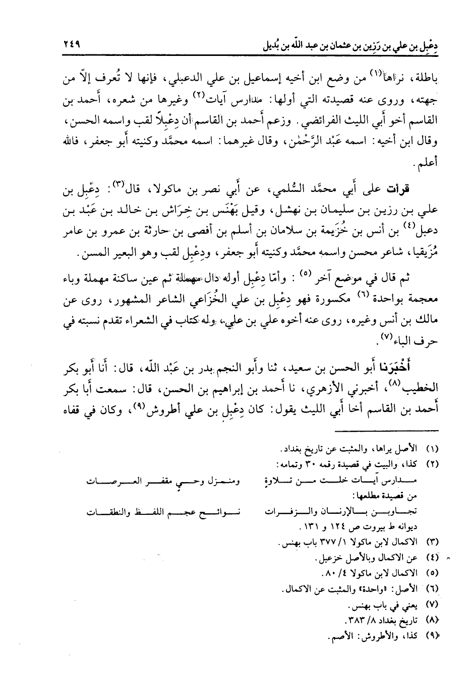 باطلة نراها (1) من وضع ابن أخيه إسماعيل بن علي الدعبلي فإنها لا تعرف إلا من جهته وروى عنه قصيدته التي أولها مدارس آيات (2) وغيرها من شعره أحمد بن القاسم أخو أبي الليث الفرائضي وزعم أحمد بن القاسم أن دعبلا لقب واسمه الحسن وقال ابن أخيه اسمه عبد الرحمن وقال غيرهما اسمه محمد وكنيته أبو جعفر فالله أعلم قرأت على أبي محمد السلمي عن أبي نصر بن ماكولا قال (3) دعبل بن علي بن رزين بن سليمان بن نهشل وقيل بهنس بن خراش بن خالد بن عبد بن دعبل (4) بن أنس بن خزيمة بن سلامان بن أسلم بن أفصى بن حارثة بن عمرو بن عامر مزيقيا شاعر محسن واسمه محمد وكنيته أبو جعفر ودعبل لقب وهو البعير المسن ثم قال في موضع آخر (5) وأما دعبل أوله دال مهملة ثم عين ساكنة مهملة وباء معجمة بواحدة (6) مكسورة فهو دعبل بن علي الخزاعي الشاعر المشهور روى عن مالك بن أنس وغيره روى عنه أخوه علي بن علي وله كتاب في الشعراء تقدم نسبته في حرف الباء (7) أخبرنا أبو الحسن بن سعيد ثنا وأبو النجم بدر بن عبد الله قال أنا أبو بكر الخطيب (8) أخبرني الأزهري نا أحمد بن إبراهيم بن الحسن قال سمعت أبا بكر أحمد بن القاسم أخا أبي الليث يقول كان دعبل بن علي أطروش (9) وكان في قفاه