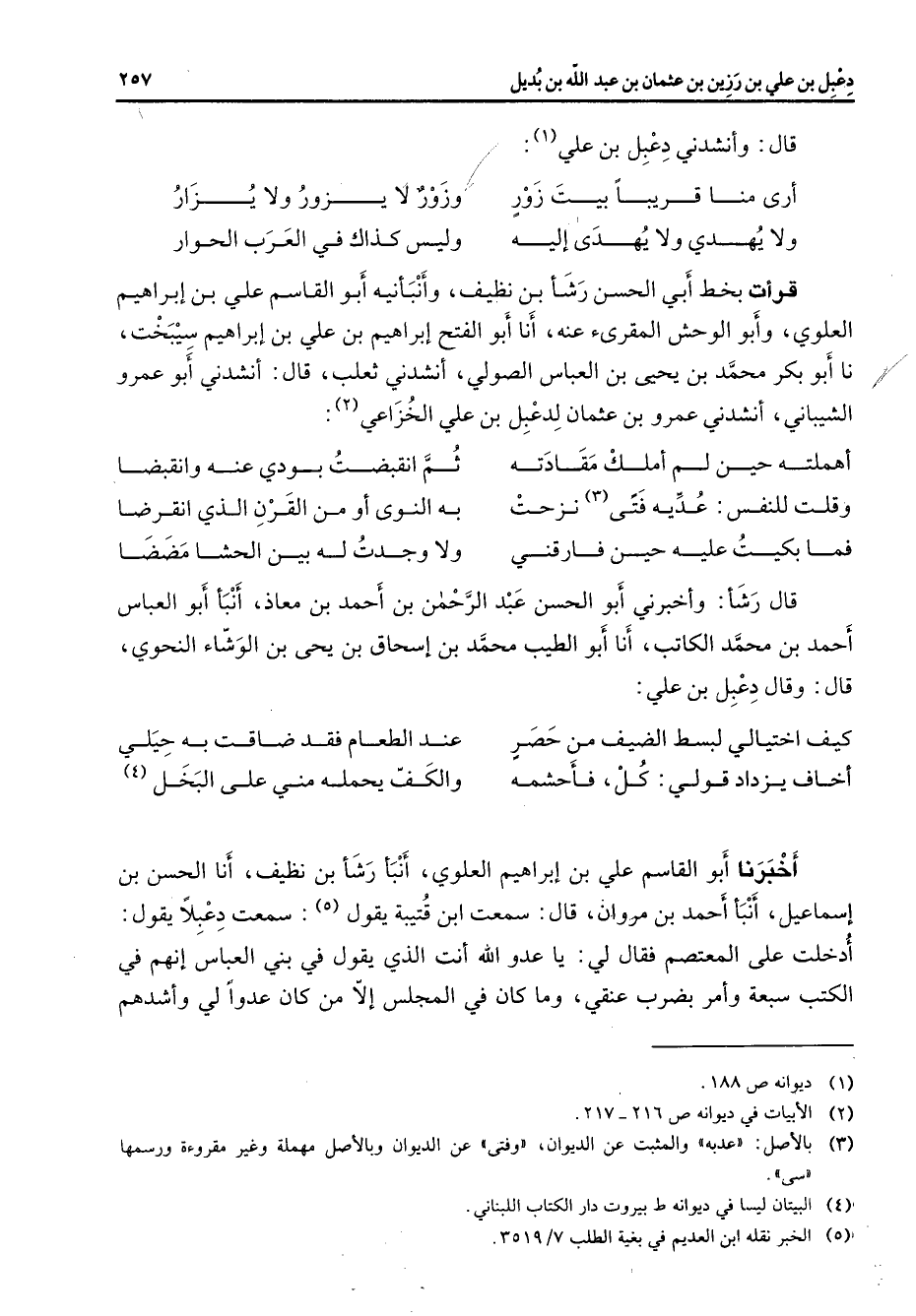 قال وأنشدني دعبل بن علي (1) * أرى منا قريبا بيت زور * وزور لا يزور ولا يزار ولا يهدي ولا يهدى إليه * وليس كذاك في العرب الحوار * قرأت بخط أبي الحسن رشأ بن نظيف وأنبأنيه أبو القاسم علي بن إبراهيم العلوي وأبو الوحش المقرئ عنه أنا أبو الفتح إبراهيم بن علي بن إبراهيم سيبخت نا أبو بكر محمد بن يحيى بن العباس الصولي أنشدني ثعلب قال أنشدني أبو عمرو الشيباني أنشدني عمرو بن عثمان لدعبل بن علي الخزاعي (2) * أهملته حين لم أملك مقادته * ثم انقبضت بودي عنه وانقبضا وقلت للنفس عديه فتى (3) نزحت * به النوى أو من القرن الذي انقرضا * * فما بكيت عليه حين فارقني * ولا وجدت له بين الحشا مضضا * قال رشأ وأخبرني أبو الحسن عبد الرحمن بن أحمد بن معاذ أنبأ أبو العباس أحمد بن محمد الكاتب أنا أبو الطيب محمد بن إسحاق بن يحيى بن الوشاء النحوي قال وقال دعبل بن علي كيف اختيالي لبسط الضيف من حصر * عند الطعام فقد ضاقت به حيلي أخاف يزداد قولي كل فأحشمه * والكف يحمله مني على البخل * (4) أخبرنا أبو القاسم علي بن إبراهيم العلوي أنبأ رشأ بن نظيف أنا الحسن بن إسماعيل أنبأ أحمد بن مروان قال سمعت ابن قتيبة يقول (5) سمعت دعبلا يقول أدخلت على المعتصم فقال لي يا عدو الله أنت الذي يقول في بني العباس إنهم في الكتب سبعة وأمر بضرب عنقي وما كان في المجلس إلا من كان عدوا لي وأشدهم