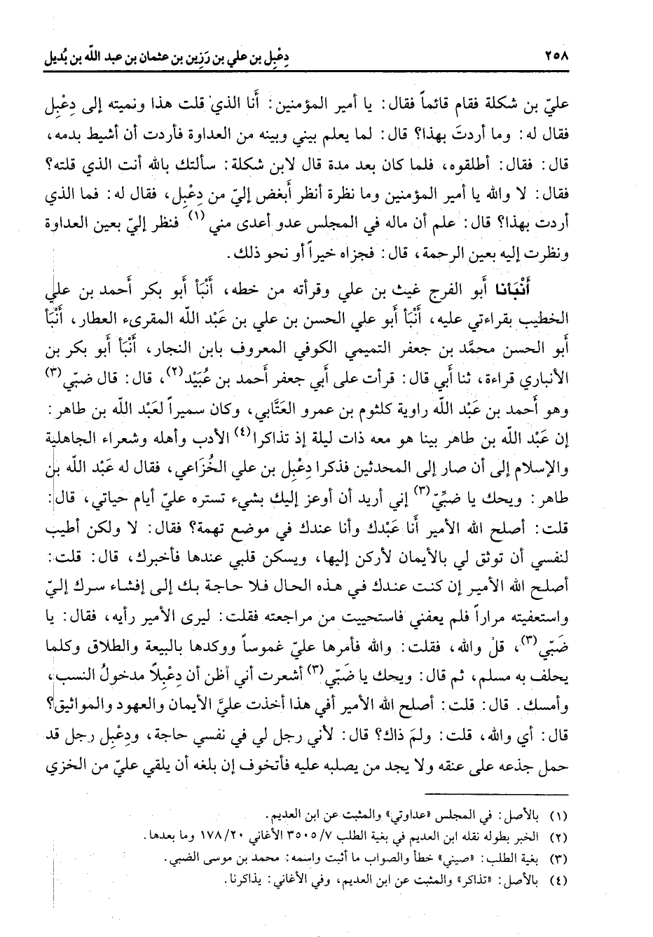 علي بن شكلة فقام قائما فقال يا أمير المؤمنين أنا الذي قلت هذا ونميته إلى دعبل فقال له وما أردت بهذا قال لما يعلم بيني وبينه من العداوة فأردت أن أشيط بدمه قال فقال أطلقوه فلما كان بعد مدة قال لابن شكلة سألتك بالله أنت الذي قلته فقال لا والله يا أمير المؤمنين وما نظرة أنظر أبغض إلي من دعبل فقال له فما الذي أردت بهذا قال علم أن ماله في المجلس عدو أعدى مني (1) فنظر إلي بعين العداوة ونظرت إليه بعين الرحمة قال فجزاه خيرا أو نحو ذلك أنبأنا أبو الفرج غيث بن علي وقرأته من خطه أنبأ أبو بكر أحمد بن علي الخطيب بقراءتي عليه أنبأ أبو علي الحسن بن علي بن عبد الله المقرئ العطار أنبأ أبو الحسن محمد بن جعفر التميمي الكوفي المعروف بابن النجار أنبأ أبو بكر بن الأنباري قراءة ثنا أبي قال قرأت على أبي جعفر أحمد بن عبيد (2) قال قال (3) ضبي وهو أحمد بن عبد الله راوية كلثوم بن عمرو العتابي وكان سميرا لعبد الله بن طاهر إن عبد الله بن طاهر بينا هو معه ذات ليلة إذ تذاكرا (4) الأدب وأهله وشعراء الجاهلية والإسلام إلى أن صار إلى المحدثين فذكرا دعبل بن علي الخزاعي فقال له عبد الله بن طاهر ويحك يا ضبي (3) إني أريد أن أوعز إليك بشئ تستره علي أيام حياتي قال قلت أصلح الله الأمير أنا عبدك وأنا عندك في موضع تهمة فقال لا ولكن أطيب لنفسي أن توثق لي بالأيمان لأركن إليها ويسكن قلبي عندها فأخبرك قال قلت أصلح الله الأمير إن كنت عندك في هذه الحال فلا حاجة بك إلى إفشاء سرك إلي واستعفيته مرارا فلم يعفني فاستحييت من مراجعته فقلت ليرى الأمير رأيه فقال يا ضبي قل والله فقلت والله فأمرها علي غموسا ووكدها بالبيعة والطلاق وكلما يحلف به مسلم ثم قال ويحك يا ضبي (3) أشعرت أني أظن أن دعبلا مدخول النسب وأمسك قال قلت أصلح الله الأمير أفي هذا أخذت علي الأيمان والعهود والمواثيق قال أي والله قلت ولم ذاك قال لأني رجل لي في نفسي حاجة ودعبل رجل قد حمل جذعه على عنقه ولا يجد من يصلبه عليه فأتخوف إن بلغه أن يلقي علي من الخزي