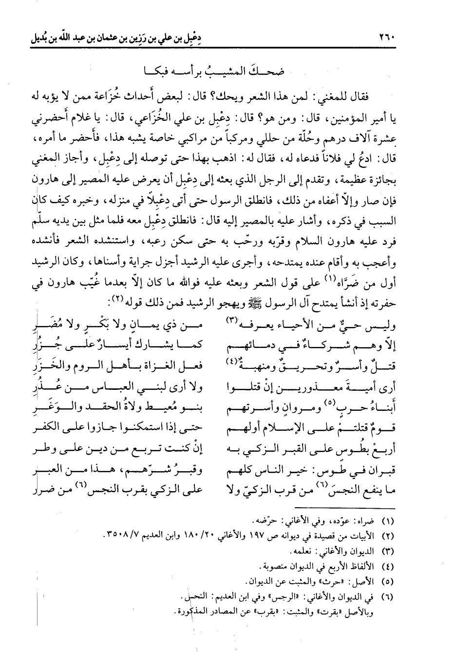 * ضحك المشيب برأسه فبكا فقال للمغني لمن هذا الشعر ويحك قال لبعض أحداث خزاعة ممن لا يؤبه له يا أمير المؤمنين قال ومن هو قال دعبل بن علي الخزاعي قال يا غلام أحضرني عشرة آلاف درهم وحلة من حللي ومركبا من مراكبي خاصة يشبه هذا فأحضر ما أمره قال ادع لي فلانا فدعاه له فقال له اذهب بهذا حتى توصله إلى دعبل وأجاز المغني بجائزة عظيمة وتقدم إلى الرجل الذي بعثه إلى دعبل أن يعرض عليه المصير إلى هارون فإن صار وإلا أعفاه من ذلك فانطلق الرسول حتى أتى دعبلا في منزله وخبره كيف كان السبب في ذكره وأشار عليه بالمصير إليه قال فانطلق دعبل معه فلما مثل بين يديه سلم فرد عليه هارون السلام وقربه ورحب به حتى سكن رعبه واستنشده الشعر فأنشده وأعجب به وأقام عنده يمتدحه وأجرى عليه الرشيد أجزل جراية وأسناها وكان الرشيد أول من ضراه (1) على قول الشعر وبعثه عليه فوالله ما كان إلا بعدما غيب هارون في حفرته إذ أنشأ يمتدح آل الرسول (صلى الله عليه وسلم) ويهجو الرشيد فمن ذلك قوله (2) * وليس حي من الأحياء يعرفه (3) * من ذي يمان ولا بكر ولا مضر إلا وهم شركاء في دمائهم * كما يشارك أيسار على جزر قتل وأسر وتحريق ومنهبة (4) * فعل الغزاة بأهل الروم والخزر أرى أمية معذورين إن قتلوا * ولا أرى لبني العباس من عذر أبناء حرب (5) ومروان وأسرتهم * بنو معيط ولاة الحقد والوغر قوم قتلتم على الإسلام أولهم * حتى إذا استمكنوا جازوا على الكفر أربع بطوس على القبر الزكي به * إن كنت تربع من دين على وطر قبران في طوس خير الناس كلهم * وقبر شرهم هذا من العبر ما ينفع النجس (6) من قرب الزكي ولا * على الزكي بقرب النجس (6) من ضرر