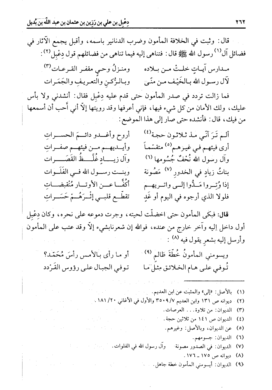 قال وثبت في الخلافة المأمون وضرب الدنانير باسمه وأقبل يجمع الآثار في فضائل آل (1) رسول الله (صلى الله عليه وسلم) قال فتناهى إليه فيما تناهى من فضائلهم قول دعبل (2) * مدارس آيات خلت من بلاده * ومنزل وحي مقفر القرعات (3) لآل رسول الله بالخيف من منى * وبالركن والتعريف والجمرات * فما زالت تردد في صدر المأمون حتى قدم عليه دعبل فقال أنشدني ولا بأس عليك ولك الأمن من كل شئ فيها فإني أعرفها وقد رويتها إلا أني أحب أن أسمعها من فيك قال فأنشده حتى صار إلى هذا الموضع * ألم تر أني مذ ثلاثون حجة (4) * أروح وأغدو دائم الحسرات أرى فيئهم في غيرهم (5) متقسما * وأيديهم من فيئهم صفرات وآل رسول الله نحف جسومها (6) * وآل زياد غلظ القصرات * * بنات زياد في الخدور (7) مصونة * وبنت رسول الله في الفلوات إذا وتروا مدوا إلى واتريهم * أكفا عن الأوتار منقبضات فلولا الذي أرجوه في اليوم أو غد * تقطع قلبي إثرهم حسرات * قال فبكى المأمون حتى اخضلت لحيته وجرت دموعه على نحره وكان دعبل أول داخل إليه وآخر خارج من عنده فوالله إن شعرنا بشئ إلا وقد عتب على المأمون وأرسل إليه بشعر يقول فيه (8) * ويسومني المأمون خطة ظالم * (9) أو ما رأى بالأمس رأس محمد توفي على هام الخلائق مثل ما * توفي الجبال على رؤوس القردد