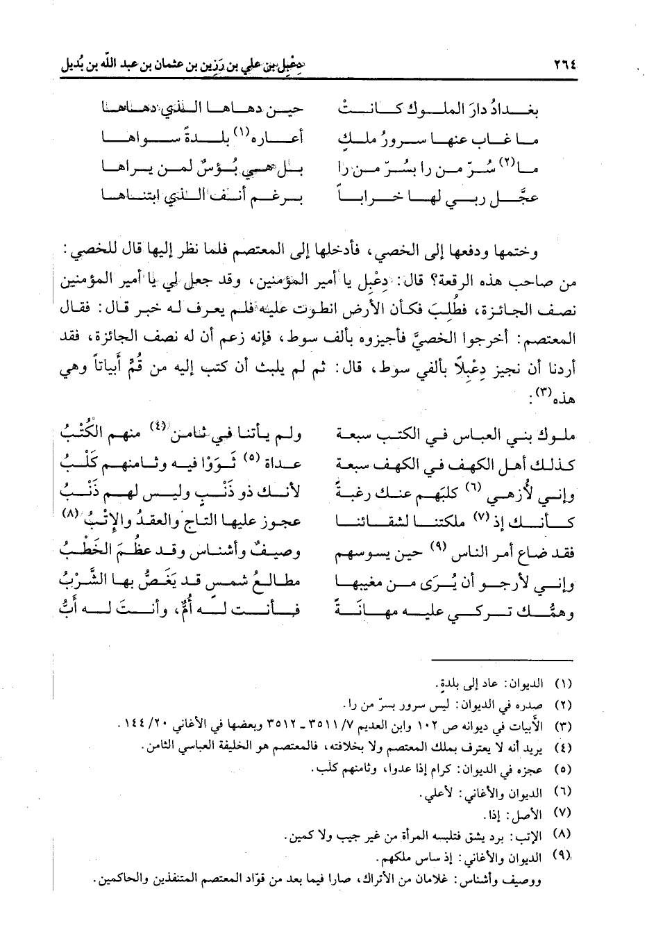 بغداد دار الملوك كانت * حين دهاها الذي دهاها ما غاب عنها سرور ملك * أعاره (1) بلدة سواها ما (2) سر من را بسر من را * بل هي بئس لمن يراها عجل ربي لها خرابا * برغم أنف الذي ابتناها وختمها ودفعها إلى الخصي فأدخلها إلى المعتصم فلما نظر إليها قال للخصي من صاحب هذه الرقعة قال دعبل يا أمير المؤمنين وقد جعل لي يا أمير المؤمنين نصف الجائزة فطلب فكأن الأرض انطوت عليه فلم يعرف له خبر قال فقال المعتصم أخرجوا الخصية فأجيزوه بألف صوت فإنه زعم أن له نصف الجائزة فقد أردنا أن نجيز دعبلا بألفي صوت قال ثم لم يلبث أن كتب إليه من قم أبياتا وهي هذه (3) * ملوك بني العباس في الكتب سبعة * ولم يأتنا في ثامن (4) منهم الكتب كذلك أهل الكهف في الكهف سبعة * عداة ثووا فيه وثامنهم كلب وإني لأزهي (6) كلبهم عنك رغبة * لأنك ذو ذنب وليس لهم ذنب كأنك إذ (7) ملكتنا لشقائنا * عجوز عليها التاج والعقد والإتب (8) فقد ضاع أمر الناس (9) حين يسوسهم * وصيف وأشناس وقد عظم الخطب وإن لأرجو أن يرى من مغيبها * مطالع شمس قد يغص بها الشرب وهمك تركي عليه مهانة * فأنت له أم وأنت له أب *