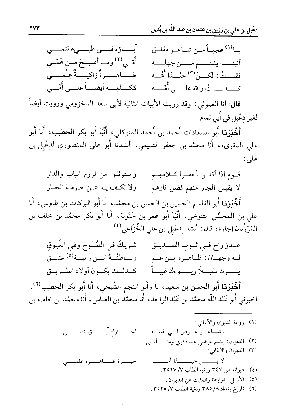 * يا (1) عجبا من شاعر مفلق * آباؤه في طيئ تنمي أتيته يشتم من جهله * أمي (2) وما أصبح من همي فقلت لكن (3) خبذا أمه * طاهرة زاكية علمي كذبت والله على أمه * ككذبه أيضا على أمي * قال أنا الصولي وقد رويت الأبيات الثانية لأبي سعد المخزومي ورويت أيضا لغير دعبل في أبي تمام أخبرنا أبو السعادات أحمد بن أحمد المتوكلي أنبأ أبو بكر الخطيب أنا أبو علي المقرئ أنا محمد بن جعفر التميمي أنشدنا أبو علي المنصوري لدعبل بن علي * قوم إذا أكلوا أخفوا كلامهم * واستوثقوا من لزوم الباب والدار لا يقبس الجار منهم فضل نارهم * ولا تكف يد عن حرمة الجار * أخبرنا أبو القاسم الحسين بن الحسن بن محمد أنا أبو البركات بن طاوس أنا علي بن المحسن التنوخي أنبأ أبو عمر بن حيوية أنا أبو بكر محمد بن خلف بن المرزبان إجازة قال أنشد لدعبل بن علي الخزاعي (4) * عدو راح في ثوب الصديق * شريك في الصبوح وفي الغبوق له وجهان ظاهره ابن عم * وباطنه ابن زانية (5) عتيق يسرك مقبلا ويسوءك غيبا * كذلك يكون أولاد الطريق * أخبرنا أبو الحسن بن سعيد نا وأبو النجم الشيحي أنا أبو بكر الخطيب (6) أخبرني أبو عبد الله محمد بن عبد الواحد أنا محمد بن العباس أنا محمد بن خلف بن