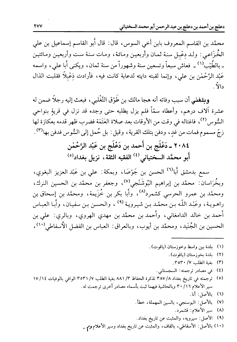 2084 - دعلج بن أحمد بن دعلج بن عبد الرحمن أبو محمد السختياني (4) الفقيه الثقة نزيل بغداد (5) سمع بدمشق أبا (6) الحسن بن جوصا وبمكة علي بن عبد العزيز البغوي وبخراسان محمد بن إبراهيم البوشنجي (7) وجعفر بن محمد بن الحسين النرك ومحمد بن عمرو الحرسي كشمرد (8) وأبا بكر بن خزيمة ومحمد بن إسحاق بن راهوية وعبد الله بن محمد بن شيروية (9) والحسن بن سفيان وأبا العباس أحمد بن خالد الدامغاني وأحمد بن محمد بن مهدي الهروي وبالري علي بن الحسين بن الجنيد ومحمد بن أيوب وبالعراق العباس بن الفضل الأسفاطي (10)