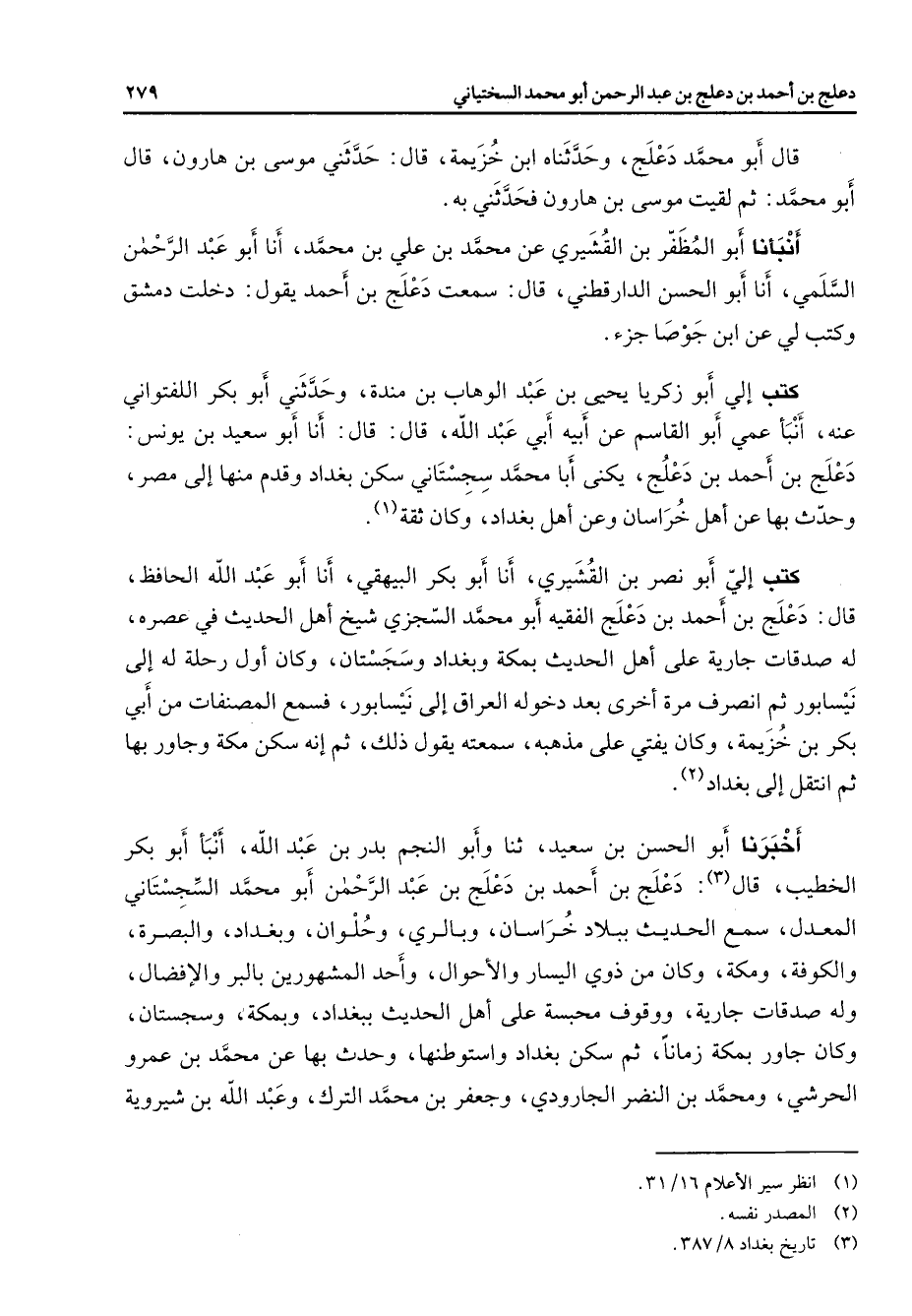 قال أبو محمد دعلج وحدثناه ابن خزيمة قال حدثني موسى بن هارون قال أبو محمد ثم لقيت موسى بن هارون فحدثني به أنبأنا أبو المظفر بن القشيري عن محمد بن علي بن محمد أنا أبو عبد الرحمن السلمي أنا أبو الحسن الدارقطني قال سمعت دعلج بن أحمد يقول دخلت دمشق وكتب لي عن ابن جوصا جزء كتب إلي أبو زكريا يحيى بن عبد الوهاب بن مندة وحدثني أبو بكر اللفتواني عنه أنبأ عمي أبو القاسم عن أبيه أبي عبد الله قال قال أنا أبو سعيد بن يونس دعلج بن أحمد بن دعلج يكنى أبا محمد سجستاني سكن بغداد وقدم منها إلى مصر وحدث بها عن أهل خراسان وعن أهل بغداد وكان ثقة (1) كتب إلي أبو نصر بن القشيري أنا أبو بكر البيهقي أنا أبو عبد الله الحافظ قال دعلج بن أحمد بن دعلج الفقيه أبو محمد السجزي شيخ أهل الحديث في عصره له صدقات جارية على أهل الحديث بمكة وبغداد وسجستان وكان أول رحلة له إلى نيسابور ثم انصرف مرة أخرى بعد دخوله العراق إلى نيسابور فسمع المصنفات من أبي بكر بن خزيمة وكان يفتي على مذهبه سمعته يقول ذلك ثم إنه سكن مكة وجاور بها ثم انتقل إلى بغداد (2) أخبرنا أبو الحسن بن سعيد ثنا وأبو النجم بدر بن عبد الله أنبأ أبو بكر الخطيب قال (3) دعلج بن أحمد بن دعلج بن عبد الرحمن أبو محمد السجستاني المعدل سمع الحديث ببلاد خراسان وبالري وحلوان وبغداد والبصرة والكوفة ومكة وكان من ذوي اليسار والأحوال وأحد المشهورين بالبر والإفضال وله صدقات جارية ووقوف محبسة على أهل الحديث ببغداد وبمكة وسجستان وكان جاور بمكة زمانا ثم سكن بغداد واستوطنها وحدث بها عن محمد بن عمرو الحرشي ومحمد بن النضر الجارودي وجعفر بن محمد الترك وعبد الله بن شيرويه
