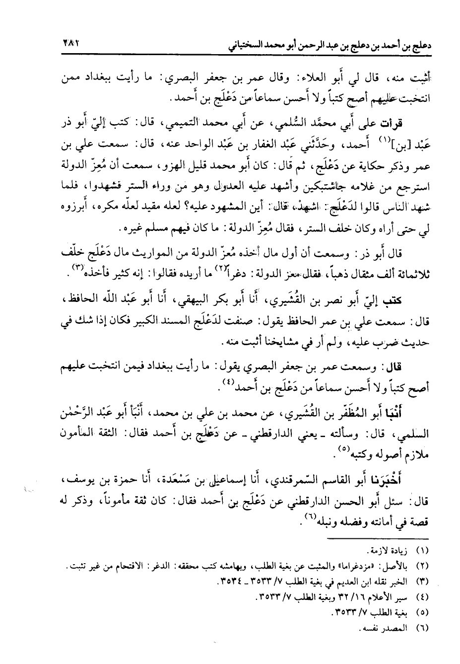 أثبت منه قال لي أبو العلاء وقال عمر بن جعفر البصري ما رأيت ببغداد ممن انتخبت عليهم أصح كتبا ولا أحسن سماعا من دعلج بن أحمد قرأت على أبي محمد السلمي عن أبي محمد التميمي قال كتب إلي أبو ذر عبد بن (1) أحمد وحدثني عبد الغفار بن عبد الواحد عنه قال سمعت علي بن عمر وذكر حكاية عن دعلج ثم قال كان أبو محمد قليل الهزو سمعت أن معز الدولة استرجع من غلامه جاشتبكين وأشهد عليه العدول وهو من وراء الستر فشهدوا فلما شهد الناس قالوا لدعلج اشهد قال أين المشهود عليه لعله مقيد لعله مكره أبرزوه لي حتى أراه وكان خلف الستر فقال معز الدولة ما كان فيهم مسلم غيره قال أبو ذر وسمعت أن أول مال أخذه معز الدولة من المواريث مال دعلج خلف ثلاثمائة ألف مثقال ذهبا فقال معز الدولة دغرا (2) ما أريده فقالوا إنه كثير فأخذه (3) كتب إلي أبو نصر بن القشيري أنا أبو بكر البيهقي أنا أبو عبد الله الحافظ قال سمعت علي بن عمر الحافظ يقول صنفت لدعلج المسند الكبير فكان إذا شك في حديث ضرب عليه ولم أر في مشايخنا أثبت منه قال وسمعت عمر بن جعفر البصري يقول ما رأيت ببغداد فيمن انتخبت عليهم أصح كتبا ولا أحسن سماعا من دعلج بن أحمد (4) أنبأ أبو المظفر بن القشيري عن محمد بن علي بن محمد أنبأ أبو عبد الرحمن السلمي قال وسألته يعني الدراقطني عن دعلج بن أحمد فقال الثقة المأمون ملازم أصوله وكتبه (5) أخبرنا أبو القاسم السمرقندي أنا إسماعيل بن مسعدة أنا حمزة بن يوسف قال سئل أبو الحسن الدارقطني عن دعلج بن أحمد فقال كان ثقة مأمونا وذكر له قصة في أمانته وفضله ونبله (6)