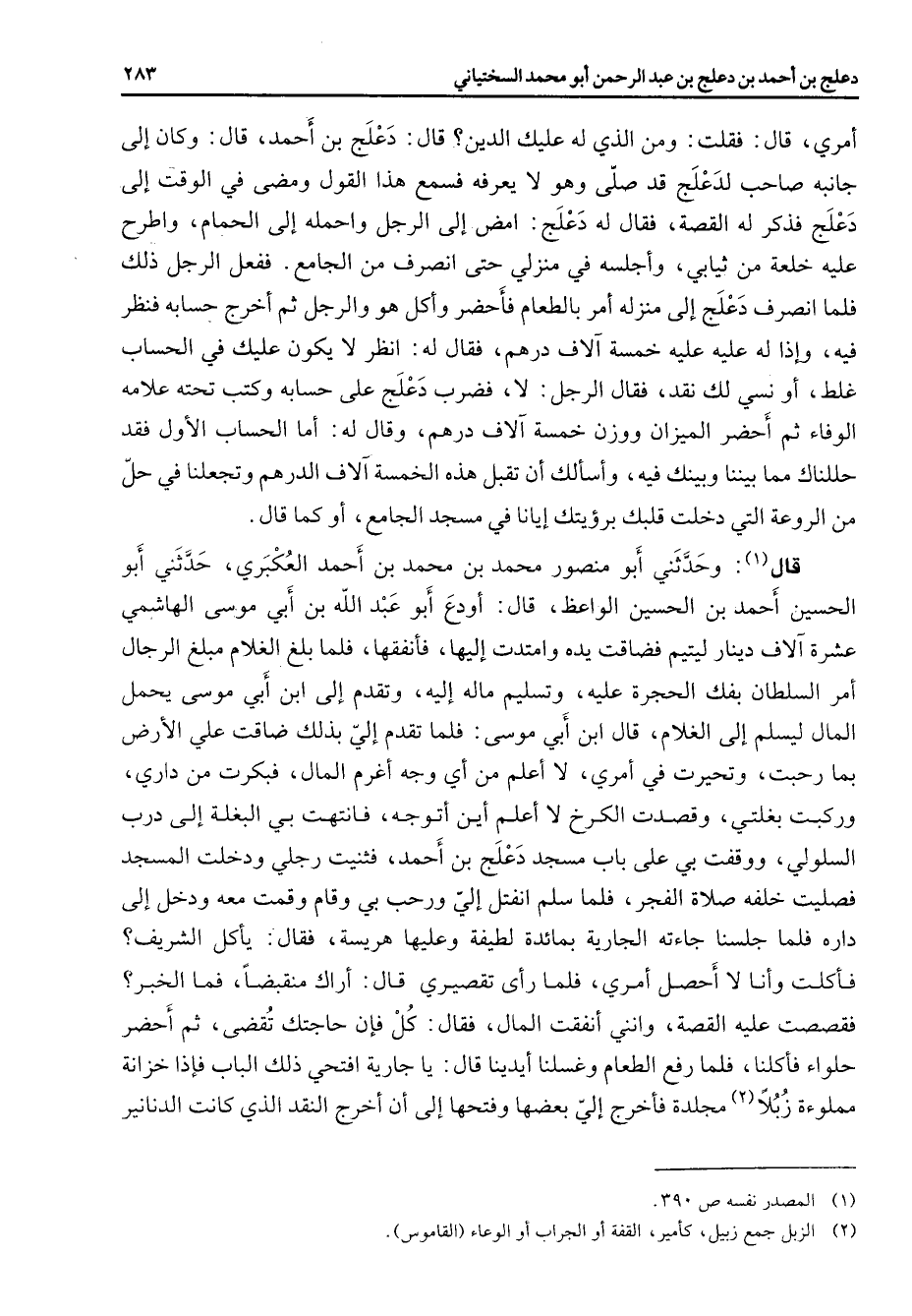 أمري قال فقلت ومن الذي له عليك الدين قال دعلج بن أحمد قال وكان إلى جانبه صاحب لدعلج قد صلى وهو لا يعرفه فسمع هذا القول ومضى في الوقت إلى دعلج فذكر له القصة فقال له دعلج امض إلى الرجل واحمله إلى الحمام واطرح عليه خلعة من ثيابي وأجلسه في منزلي حتى انصرف من الجامع ففعل الرجل ذلك فلما انصرف دعلج إلى منزله أمر بالطعام فأحضر وأكل هو والرجل ثم أخرج حسابه فنظر فيه وإذا له عليه عليه خمسة آلاف درهم فقال له انظر لا يكون عليك في الحساب غلط أو نسي لك نقد فقال الرجل لا فضرب دعلج على حسابه وكتب تحته علامه الوفاء ثم أحضر الميزان ووزن خمسة آلاف درهم وقال له أما الحساب الأول فقد حللناك مما بيننا وبينك فيه وأسألك أن تقبل هذه الخمسة آلاف الدرهم وتجعلنا في حل من الروعة التي دخلت قلبك برؤيتك إيانا في مسجد الجامع أو كما قال قال (1) وحدثني أبو منصور محمد بن محمد بن أحمد العكبري حدثني أبو الحسين أحمد بن الحسين الواعظ قال أودع أبو عبد الله بن أبي موسى الهاشمي عشرة آلاف دينار ليتيم فضاقت يده وامتدت إليها فأنفقها فلما بلغ الغلام مبلغ الرجال أمر السلطان بفك الحجرة عليه وتسليم ماله إليه وتقدم إلى ابن أبي موسى يحمل المال ليسلم إلى الغلام قال ابن أبي موسى فلما تقدم إلي بذلك ضاقت علي الأرض بما رحبت وتحيرت في أمري لا أعلم من أي وجه أغرم المال فبكرت من داري وركبت بغلتي وقصدت الكرخ لا أعلم أين أتوجه فانتهت بي البغلة إلى درب السلولي ووقفت بي على باب مسجد دعلج بن أحمد فثنيت رجلي ودخلت المسجد فصليت خلفه صلاة الفجر فلما سلم انفتل إلي ورحب بي وقام وقمت معه ودخل إلى داره فلما جلسنا جاءته الجارية بمائدة لطيفة وعليها هريسة فقال يأكل الشريف فأكلت وأنا لا أحصل أمري فلما رأى تقصيري قال أراك منقبضا فما الخبر فقصصت عليه القصة وأنني أنفقت المال فقال كل فإن حاجتك تقضى ثم أحضر حلواء فأكلنا فلما رفع الطعام وغسلنا أيدينا قال يا جارية افتحي ذلك الباب فإذا خزانة مملوءة زبلا (2) مجلدة فأخرج إلي بعضها وفتحها إلى أن أخرج النقد الذي كانت الدنانير