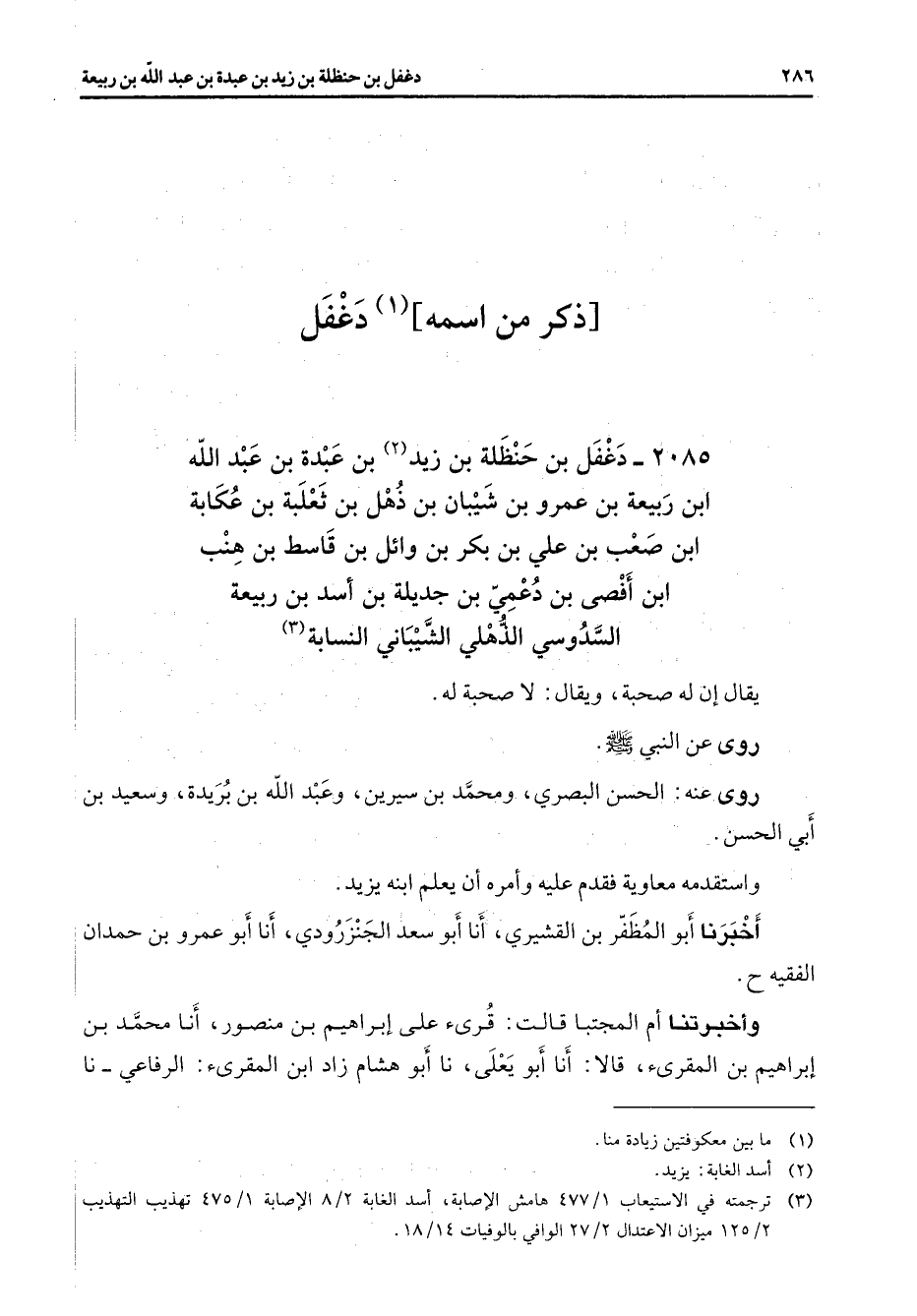 2085 - دغفل بن حنظلة بن زيد (2) بن عبدة بن عبد الله ابن ربيعة بن عمرو بن شيبان بن ذهل بن ثعلبة بن عكابة ابن صعب بن علي بن بكر بن وائل بن قاسط بن هنب ابن أفصى بن دعمي بن جديلة بن أسد بن ربيعة السدوسي الذهلي الشيباني النسابة (3) يقال إن له صحبة ويقال لا صحبة له روى عن النبي (صلى الله عليه وسلم) روى عنه الحسن البصري ومحمد بن سيرين وعبد الله بن بريدة وسعيد بن أبي الحسن واستقدمه معاوية فقدم عليه وأمره أن يعلم ابنه يزيد أخبرنا أبو المظفر بن القشيري أنا أبو سعد الجنزرودي أنا أبو عمرو بن حمدان الفقيه وأخبرتنا أم المجتبا قالت قرأ على إبراهيم بن منصور أنا محمد بن إبراهيم بن المقرئ قالا أنا أبو يعلى نا أبو هشام زاد ابن المقرئ الرفاعي نا