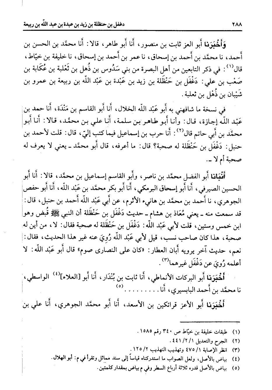 محمد بن أبي حاتم قال (2) أنا حرب بن إسماعيل فيما كتب إلي قال قلت لأحمد بن حنبل دغفل بن حنظلة له صحبة قال ما أعرفه قال أبو محمد يعني لا يعرف له صحبة أم لا أنبأنا أبو الفضل محمد بن ناصر وأبو القاسم إسماعيل بن محمد قالا أنا أبو الحسين الصيرفي أنا أبو إسحاق البرمكي أنا أبو بكر محمد بن عبد الله أنا أبو حفص الجوهري نا أحمد بن محمد بن هانئ الأثرم عن أبي عبد الله أحمد بن حنبل قال قد سمعت منه يعني معاذ بن هشام حديث دغفل بن حنظلة أن النبي (صلى الله عليه وسلم) قبض وهو ابن خمس وستين قلت لأبي عبد الله دغفل بن حنظلة له صحبة فقال لا من أين له صحبة هذا كان صاحب نسب قيل لأبي عبد الله روي عنه غير هذا الحديث فقال نعم حديث آخر يرويه أبان العطار كان على النصارى صوم قال أبو عبد الله لا أعلمه روي عن دغفل غيرهما (3) أخبرنا أبو البركات الأنماطي أنا ثابت بن بندار أنا أبو العلاء (4) الواسطي نا محمد بن أحمد البابسيري أنا 00000 (5) أخبرنا أبو العز قراتكين بن الأسعد أنا أبو محمد الجوهري أنا علي بن