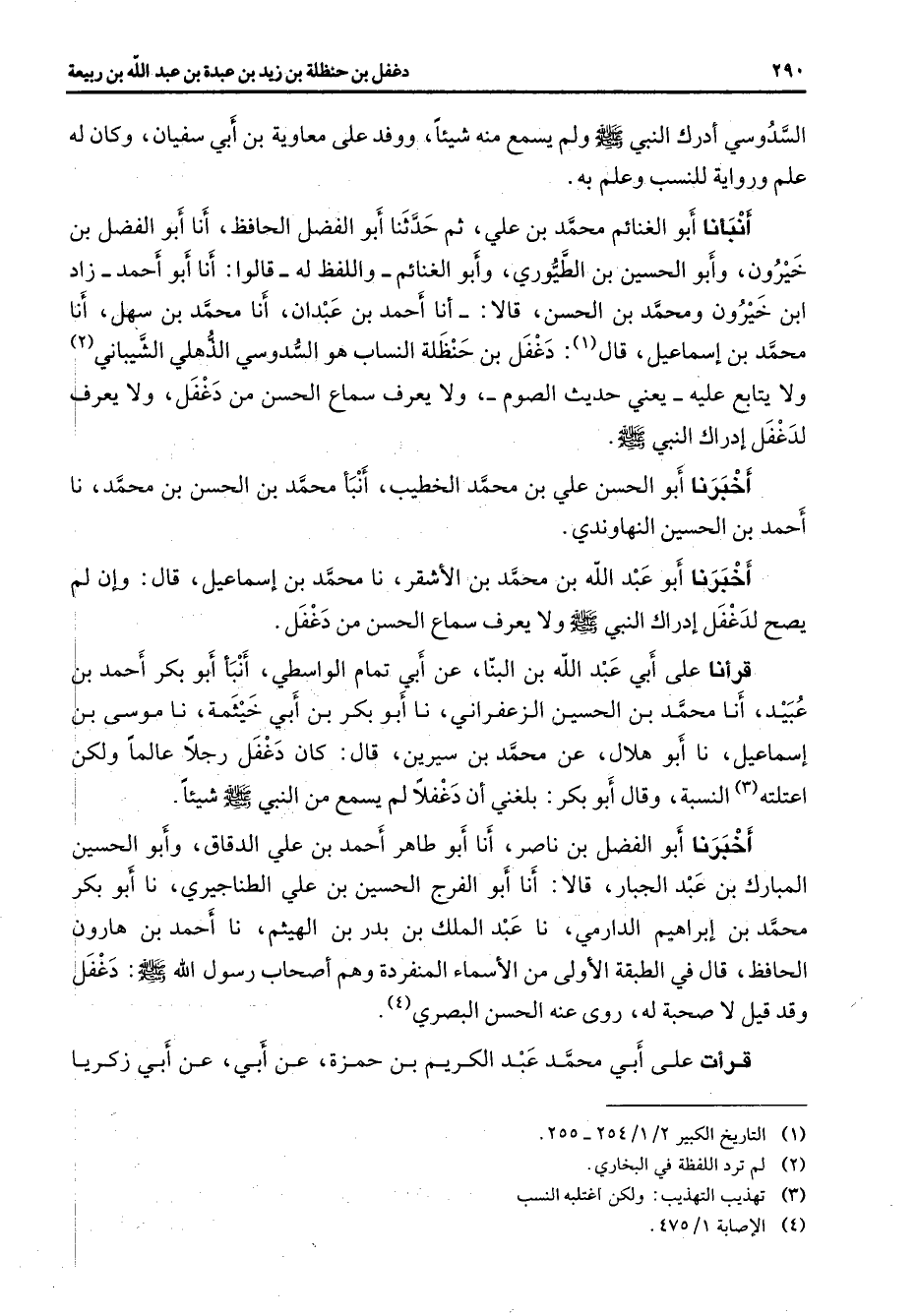 السدوسي أدرك النبي (صلى الله عليه وسلم) ولم يسمع منه شيئا ووفد على معاوية بن أبي سفيان وكان له علم ورواية للنسب وعلم به أنبأنا أبو الغنائم محمد بن علي ثم حدثنا أبو الفضل الحافظ أنا أبو الفضل بن خيرون وأبو الحسين بن الطيوري وأبو الغنائم واللفظ له قالوا أنا أبو أحمد زاد ابن خيرون ومحمد بن الحسن قالا أنا أحمد بن عبدان أنا محمد بن سهل أنا محمد بن إسماعيل قال (1) دغفل بن حنظلة النساب هو السدوسي الذهلي الشيباني (2) ولا يتابع عليه يعني حديث الصوم ولا يعرف سماع الحسن من دغفل ولا يعرف لدغفل إدراك النبي (صلى الله عليه وسلم) أخبرنا أبو الحسن علي بن محمد الخطيب أنبأ محمد بن الحسن بن محمد نا أحمد بن الحسين النهاوندي أخبرنا أبو عبد الله بن محمد بن الأشقر نا محمد بن إسماعيل قال وإن لم يصح لدغفل إدراك النبي (صلى الله عليه وسلم) ولا يعرف سماع الحسن من دغفل قرأنا على أبي عبد الله بن البنا عن أبي تمام الواسطي أنبأ أبو بكر أحمد بن عبيد أنا محمد بن الحسين الزعفراني نا أبو بكر بن أبي خيثمة نا موسى بن إسماعيل نا أبو هلال عن محمد بن سيرين قال كان دغفل رجلا عالما ولكن اعتلته (3) النسبة وقال أبو بكر بلغني أن دغفل لم يسمع من النبي (صلى الله عليه وسلم) شيئا أخبرنا أبو الفضل بن ناصر أنا أبو طاهر أحمد بن علي الدقاق وأبو الحسين المبارك بن عبد الجبار قالا أنا أبو الفرج الحسين بن علي الطناجيري نا أبو بكر محمد بن إبراهيم الدارمي نا عبد الملك بن بدر بن الهيثم نا أحمد بن هارون الحافظ قال في الطبقة الأولى من الأسماء المنفردة وهم أصحاب رسول الله (صلى الله عليه وسلم) دغفل وقد قيل لا صحبة له روى عنه الحسن البصري (4) قرأت على أبي محمد عبد الكريم بن حمزة عن أبي عن أبي زكريا