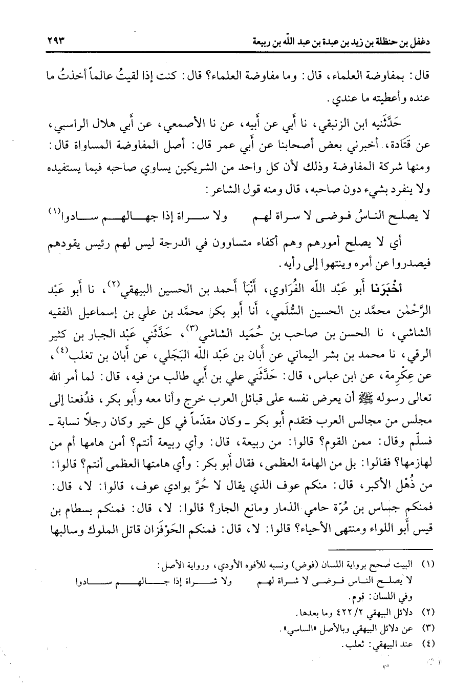 قال بمفاوضة العلماء قال وما مفاوضة العلماء قال كنت إذا لقيت عالما أخذت ما عنده وأعطيته ما عندي حدثنيه ابن الزنبقي نا أبي عن أبيه عن نا الأصمعي عن أبي هلال الراسبي عن قتادة أخبرني بعض أصحابنا عن أبي عمر قال أصل المفاوضة المساواة قال ومنها شركة المفاوضة وذلك لأن كل واحد من الشريكين يساوي صاحبه فيما يستفيده ولا ينفرد بشئ دون صاحبه قال ومنه قول الشاعر * لا يصلح الناس فوضى لا سراة لهم * ولا سراة إذا جهالهم سادوا (1) * أي لا يصلح أمورهم وهم أكفاء متساوون في الدرجة ليس لهم رئيس يقودهم فيصدروا عن أمره وينتهوا إلى رأيه أخبرنا أبو عبد الله الفراوي أنبأ أحمد بن الحسين البيهقي (2) نا أبو عبد الرحمن محمد بن الحسين السلمي أنا أبو بكر محمد بن علي بن إسماعيل الفقيه الشاشي نا الحسن بن صاحب بن حميد الشاشي (3) حدثني عبد الجبار بن كثير الرقي نا محمد بن بشر اليماني عن أبان بن عبد الله البجلي عن أبان بن تغلب (4) عن عكرمة عن ابن عباس قال حدثني علي بن أبي طالب من فيه قال لما أمر الله تعالى رسوله (صلى الله عليه وسلم) أن يعرض نفسه على قبائل العرب خرج وأنا معه وأبو بكر فدفعنا إلى مجلس من مجالس العرب فتقدم أبو بكر وكان مقدما في كل خير وكان رجلا نسابة فسلم وقال ممن القوم قالوا من ربيعة قال وأي ربيعة أنتم أمن هامها أم من لهازمها فقالوا بل من الهامة العظمى فقال أبو بكر وأي هامتها العظمى أنتم قالوا من ذهل الأكبر قال منكم عوف الذي يقال لا حر بوادي عوف قالوا لا قال فمنكم جساس بن مرة حامي الذمار ومانع الجار قالوا لا قال فمنكم بسطام بن قيس أبو اللواء ومنتهى الأحياء قالوا لا قال فمنكم الحوفزان قاتل الملوك وسالبها