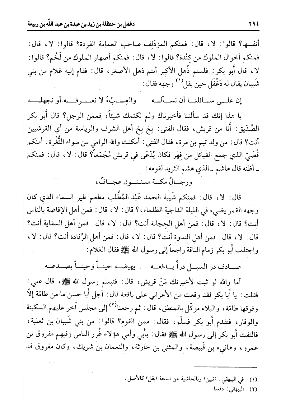 أنفسها قالوا لا قال فمنكم المزدلف صاحب العمامة الفردة قالوا لا قال فمنكم أخوال الملوك من كندة قالوا لا قال فمنكم أصهار الملوك من لخم قالوا لا قال أبو بكر فلستم ذهل الأكبر أنتم ذهل الأصغر قال فقام إليه غلام من بني شيبان يقال له دغفل حين بقل (1) وجهه فقال * إن على سائلنا أن نسأله * والعبء لا نعرفه أو نجهله * يا هذا إنك قد سألتنا فأخبرناك ولم نكتمك شيئا فممن الرجل قال أبو بكر الصديق أنا من قريش فقال الفتى بخ بخ أهل الشرف والرياسة من أي القرشيين أنت قال من ولد تيم بن مرة قال الفتى أمكنت والله الرامي من سواء الثغرة أمنكم قصي الذي جمع القبائل من فهر فكان يدعى في قريش مجمعا قال لا قال فمنكم أظنه قال هاشم الذي هشم الثريد لقومه * ورجال مكة مسنتون عجاف قال لا قال فمنكم شيبة الحمد عبد المطلب مطعم طير السماء الذي كان وجهه القمر يضئ في الليلة الداجية الظلماء قال لا قال فمن أهل الإفاضة بالناس أنت قال لا قال فمن أهل الحجابة أنت قال لا قال فمن أهل السقاية أنت قال لا قال فمن أهل الندوة أنت قال لا قال فمن أهل الرفادة أنت قال لا واجتذب أبو بكر زمام الناقة راجعا إلى رسول الله (صلى الله عليه وسلم) فقال الغلام * صادف در السيل درأ يدفعه * يهيضه حينا وحينا يصدعه * أما والله لو ثبت لأخبرتك من قريش قال فتبسم رسول الله (صلى الله عليه وسلم) قال علي فقلت يا أبا بكر لقد وقعت من الأعرابي على باقعة قال أجل أبا حسن ما من طامة إلا وفوقها طامة والبلاء موكل بالمنطق قال ثم رجعنا (2) إلى مجلس آخر عليهم السكينة والوقار فتقدم أبو بكر فسلم فقال ممن القوم قالوا من بني شيبان بن ثعلبة فالتفت أبو بكر إلى رسول الله (صلى الله عليه وسلم) فقال بأبي وأمي هؤلاء غرر الناس وفيهم مفروق بن عمرو وهانئ بن قبيصة والمثنى بن حارثة والنعمان بن شريك وكان مفروق قد