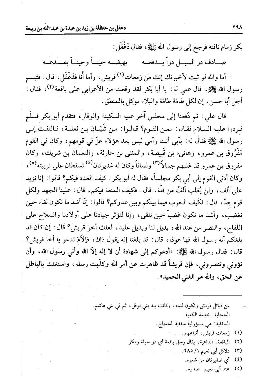 بكر زمام ناقته فرجع إلى رسول الله (صلى الله عليه وسلم) فقال دغفل صادف در السيل درا يدفعه * يهيضه حينا وحينا يصدعه * أما والله لو ثبت لأخبرتك إنك من زمعات (1) قريش وأما أنا فدغفل قال فتبسم رسول الله (صلى الله عليه وسلم) قال علي له يا أبا بكر لقد وقعت من الأعرابي على باقعة (2) فقال أجل أبا حسن إن لكل طامة طامة والبلاء موكل بالمنطق قال علي ثم دفعنا إلى مجلس آخر عليه السكينة والوقار فتقدم أبو بكر فسلم فردوا عليه السلام فقال ممن القوم قالوا من شيبان بن ثعلبة فالتفت إلى رسول الله (صلى الله عليه وسلم) فقال له بأبي أنت وأمي ليس بعد هؤلاء عز في قومهم وكان في القوم مفروق بن عمرو وهانئ بن قبيصة والمثنى بن حارثة والنعمان بن شريك وكان مفروق بن عمرو قد غلبهم جمالا (3) ولسانا وكان له غديرتان (4) تسقطان على تريبته (5) وكان أدنى القوم إلى أبي بكر مجلسا فقال له أبو بكر كيف العدد فيكم قالوا إنا نزيد على ألف ولن يغلب ألف من قلة قال فكيف المنعة فيكم قال علينا الجهد ولكل قوم جد قال فكيف الحرب فيما بينكم وبين عدوكم قالوا إنا أشد ما نكون لقاء حين نغضب وأشد ما نكون غضبا حين نلقى وإنا لنؤثر جيادنا على أولادنا والسلاح على اللقاح والنصر من عند الله يديل لنا ويديل علينا لعلك أخو قريش قال إن كان قد بلغكم أنه رسول الله فها هوذا قال قد بلغنا إنه يقول ذاك فإلام تدعو يا أخا قريش قال فقال رسول الله (صلى الله عليه وسلم) أدعوكم إلى شهادة أن لا إله إلا الله وأني رسول الله وأن تؤوني وتنصروني فإن قريشا قد ظاهرت عن أمر الله وكذبت رسله واستغنت بالباطل عن الحق والله هو الغني الحميد