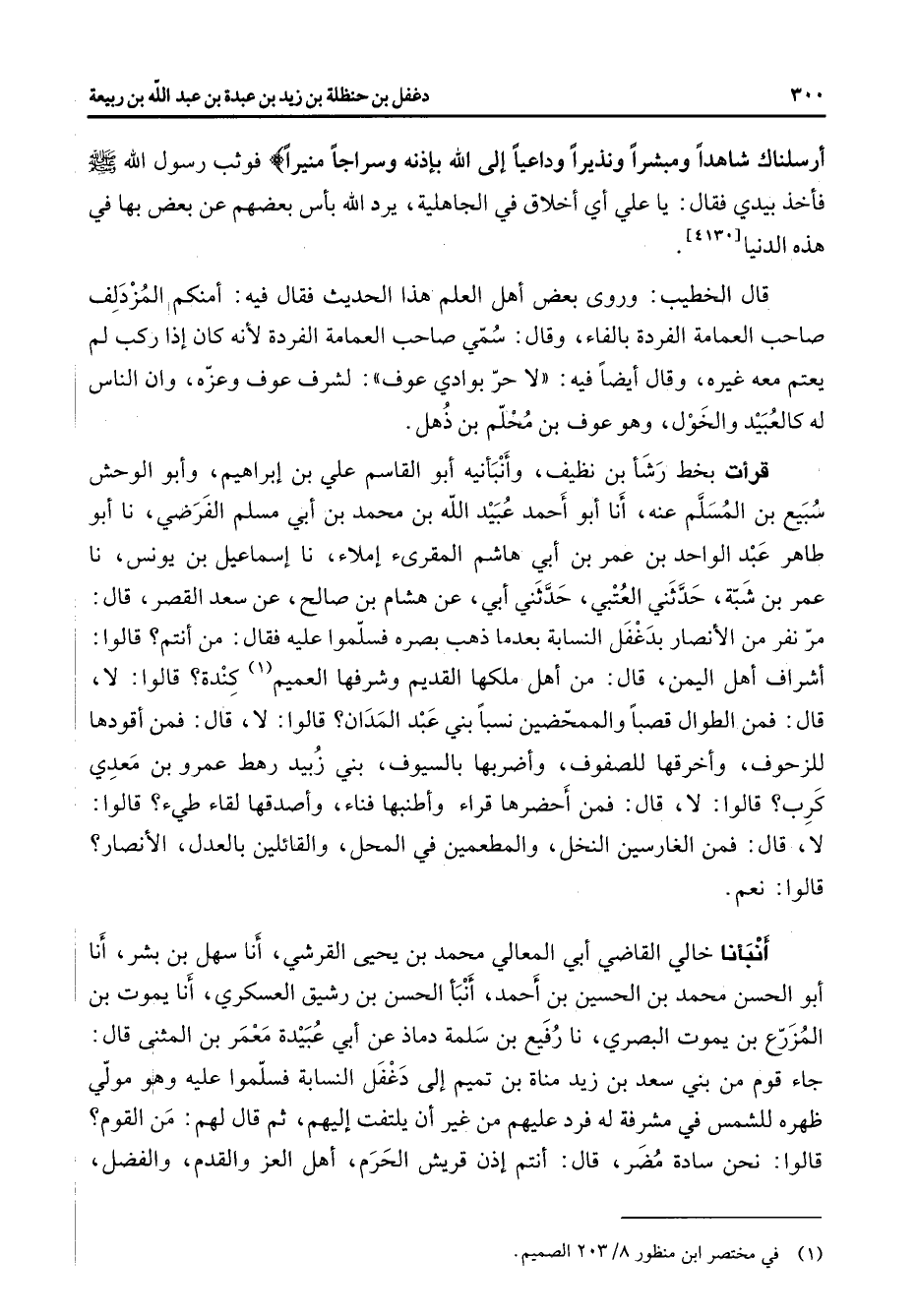 " " أرسلناك شاهدا ومبشرا ونذيرا وداعيا إلى الله بإذنه وسراجا منيرا " فوثب رسول الله (صلى الله عليه وسلم) فأخذ بيدي فقال يا علي أي أخلاق في الجاهلية يرد الله بأس بعضهم عن بعض بها في هذه الدنيا قال الخطيب وروى بعض أهل العلم هذا الحديث فقال فيه أمنكم المزدلف صاحب العمامة الفردة بالفاء وقال سمي صاحب العمامة الفردة لأنه كان إذا ركب لم يعتم معه غيره وقال أيضا فيه لا حر بوادي عوف لشرف عوف وعزه وإن الناس له كالعبيد والخول وهو عوف بن محلم بن ذهل قرأت بخط رشأ بن نظيف وأنبأنيه أبو القاسم علي بن إبراهيم وأبو الوحش سبيع بن المسلم عنه أنا أبو أحمد عبيد الله بن محمد بن أبي مسلم الفرضي نا أبو طاهر عبد الواحد بن عمر بن أبي هاشم المقرئ إملاء نا إسماعيل بن يونس نا عمر بن شبة حدثني العتبي حدثني أبي عن هشام بن صالح عن سعد القصر قال مر نفر من الأنصار بدغفل النسابة بعدما ذهب بصره فسلموا عليه فقال من أنتم قالوا أشراف أهل اليمن قال من أهل ملكها القديم وشرفها العميم (1) كندة قالوا لا قال فمن الطوال قصبا والممحضين نسبا بني عبد المدان قالوا لا قال فمن أقودها للزحوف وأخرقها للصفوف وأضربها بالسيوف بني زبيد رهط عمرو بن معدي كرب قالوا لا قال فمن أحضرها قراء وأطنبها فناء وأصدقها لقاء طئ قالوا لا قال فمن الغارسين النخل والمطعمين في المحل والقائلين بالعدل الأنصار قالوا نعم أنبأنا خالي القاضي أبي المعالي محمد بن يحيى القرشي أنا سهل بن بشر أنا أبو الحسن محمد بن الحسين بن أحمد أنبأ الحسن بن رشيق العسكري أنا يموت بن المزرع بن يموت البصري نا رفيع بن سلمة دماذ عن أبي عبيدة معمر بن المثنى قال جاء قوم من بني سعد بن زيد مناة بن تميم إلى دغفل النسابة فسلموا عليه وهو مولى ظهره للشمس في مشرفة له فرد عليهم من غير أن يلتفت إليهم ثم قال لهم من القوم قالوا نحن سادة مضر قال أنتم إذن قريش الحرم أهل العز والقدم والفضل