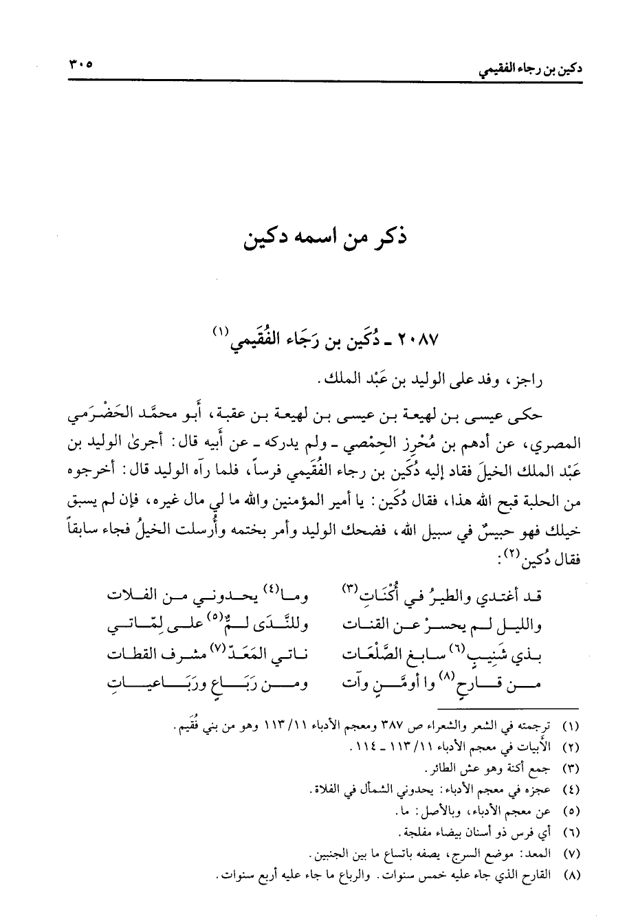 2087 - دكين بن رجاء الفقيمي (1) راجز وفد على الوليد بن عبد الملك حكى عيسى بن لهيعة بن عيسى بن لهيعة بن عقبة أبو محمد الحضرمي المصري عن أدهم بن محرز الحمصي ولم يدركه عن أبيه قال أجرى الوليد بن عبد الملك الخيل فقاد إليه دكين بن رجاء الفقيمي فرسا فلما رآه الوليد قال أخرجوه من الحلبة قبح الله هذا فقال دكين يا أمير المؤمنين والله مالي مال غيره فإن لم يسبق خيلك فهو حبيس في سبيل الله فضحك الوليد وأمر بختمه وأرسلت الخيل فجاء سابقا فقال دكين (2) * قد أغتدي والطير في أكنات (3) * وما (4) يحدوني من الفلات والليل لم يحسر عن القنات * وللندى لم (5) على لماتي بذي شنيب (6) سابغ الصلعات * ناتي المعد (7) مشرف القطات من قارح (8) وا أو من وآت * ومن رباع ورباعيات