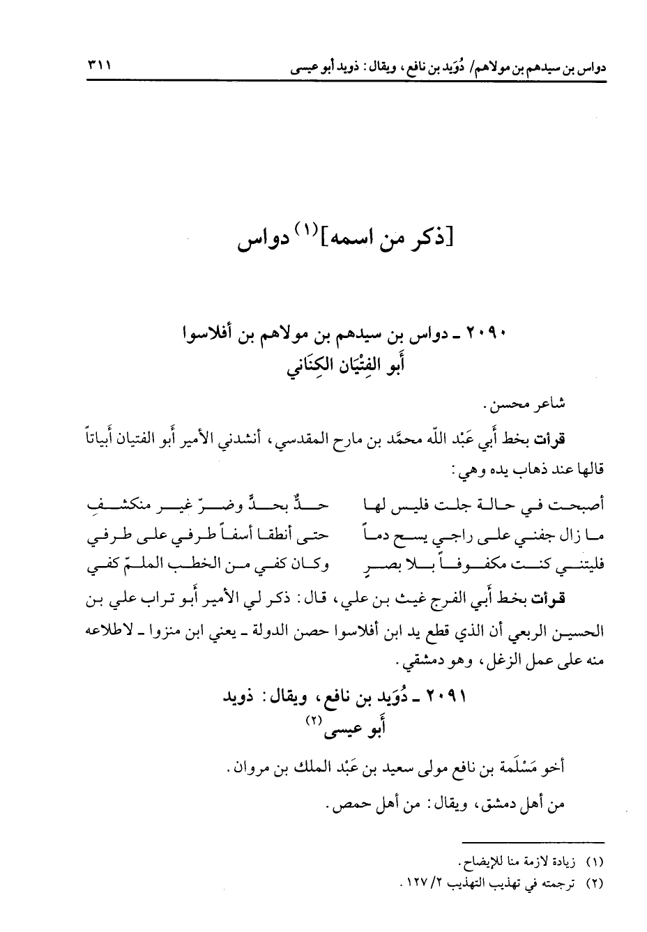 2090 - دواس بن سيدهم بن مولاهم بن أفلاسوا أبو الفتيان الكناني شاعر محسن قرأت بخط أبي عبد الله محمد بن مارح المقدسي أنشدني الأمير أبو الفتيان أبياتا 1 قالها عند ذاهب يده وهي أصبحت في حالة جلت فليس لها * حد بحد وضر غير منكشف ما زال جفني على راجي يسح دما * حتى أنطقا أسفا طرفي على طرفي فليتني كنت مكفوفا بلا بصر * وكان كفي من الخطب الملم كفي * قرأت بخط أبي الفرج غيث بن علي قال ذكر لي الأمير أبو تراب علي بن الحسين الربعي أن الذي قطع يد ابن أفلاسوا حصن الدولة يعني ابن منزوا لاطلاعه منه على عمل الزغل وهو دمشقي